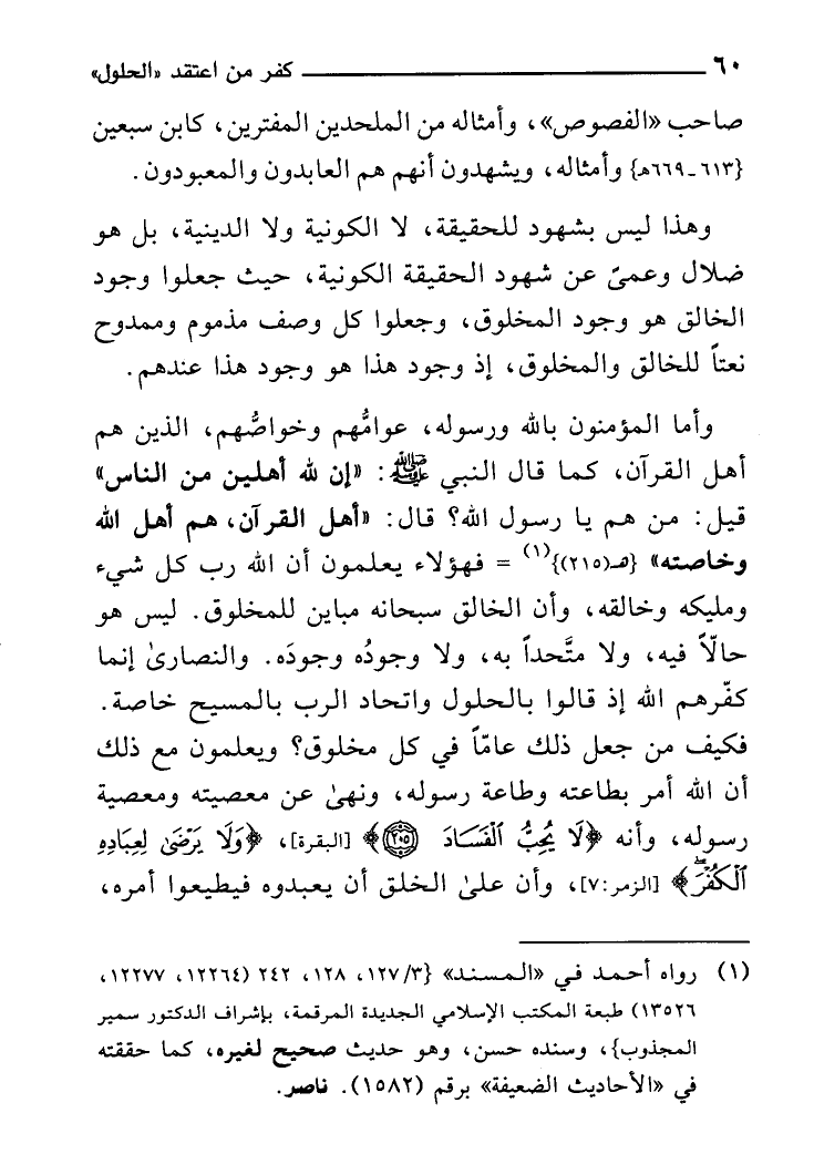 وَأما الْمُؤْمِنُونَ بِاللَّه وَرَسُوله عوامهم وخواصهم الَّذين هم أهل الْقُرْآن كَمَا قَالَ النَّبِي صلى الله عَلَيْهِ وَسلم: " إِن لله أهلين من النَّاس " قيل: من هم يَا رَسُول الله؟ قَالَ: " أهل الْقُرْآن هم أهل الله وخاصته " فَهَؤُلَاءِ يعلمُونَ أَن الله رب كل شَيْء ومليكه وخالقه وَأَن الْخَالِق سُبْحَانَهُ مباين للمخلوق لَيْسَ هُوَ حالاًّ فِيهِ وَلَا متّحدًا بِهِ وَلَا وجودُه وجودَه. وَالنَّصَارَى إِنَّمَا كفّرهم الله إِذْ قَالُوا بالحلول واتحاد الرب بالمسيح خَاصَّة فَكيف من جعل ذَلِك عَاما فِي كل مَخْلُوق؟ ويعلمون مَعَ ذَلِك أَن الله أَمر بِطَاعَتِهِ وَطَاعَة رَسُوله وَنهى عَن مَعْصِيَته ومعصية رَسُوله وَأَنه لَا يحب الْفساد وَلَا يرضى لِعِبَادِهِ الْكفْر وَأَن على الْخلق أَن يعبدوه فيطيعوا أمره