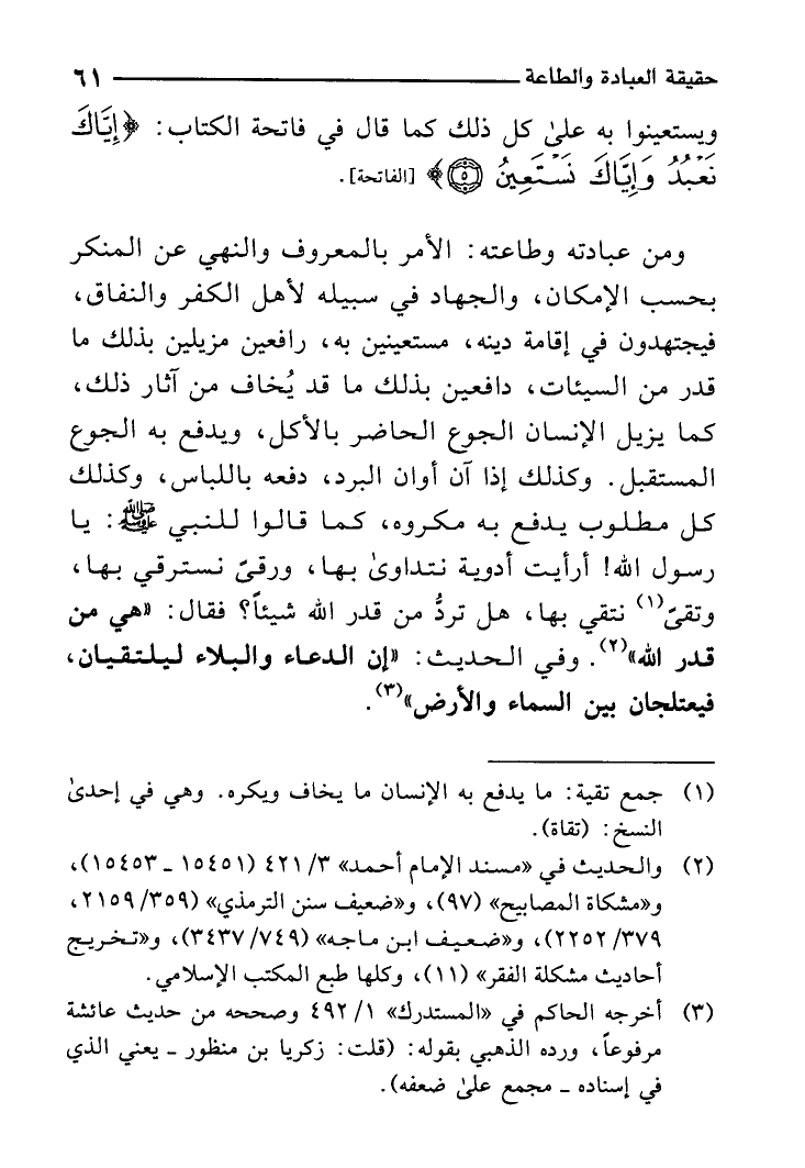 وَمن عِبَادَته وطاعته: الْأَمر بِالْمَعْرُوفِ وَالنَّهْي عَن الْمُنكر بِحَسب الْإِمْكَان وَالْجهَاد فِي سَبيله لأهل الْكفْر والنفاق فيجتهدون فِي إِقَامَة دينه مستعينين بِهِ رافعين مزيلين بذلك مَا قدر من السَّيِّئَات دافعين بذلك مَا قد يخَاف من آثَار ذَلِك كَمَا يزِيل الْإِنْسَان الْجُوع الْحَاضِر بِالْأَكْلِ وَيدْفَع بِهِ الْجُوع الْمُسْتَقْبل وَكَذَلِكَ إِذا آن أَوَان الْبرد دَفعه باللباس وَكَذَلِكَ كل مَطْلُوب يدْفع بِهِ مَكْرُوه كَمَا قَالُوا للنَّبِي صلى الله عَلَيْهِ وَسلم: يَا رَسُول الله أَرَأَيْت أدوية نتداوى بهَا ورقى نسترقي بهَا وتقى نتقي بهَا هَل ترد من قدر الله شَيْئا؟ فَقَالَ: " هِيَ من قدر الله " وَفِي الحَدِيث: " إِن الدُّعَاء وَالْبَلَاء ليلتقيان فيعتلجان بَين السَّمَاء وَالْأَرْض ".