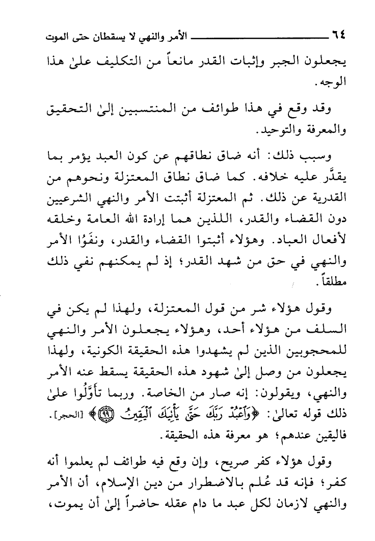 وَقَول هَؤُلَاءِ شَرّ من قَول الْمُعْتَزلَة وَلِهَذَا لم يكن فِي السّلف من هَؤُلَاءِ أحد، وَهَؤُلَاء يجْعَلُونَ الْأَمر وَالنَّهْي للمحجوبين الَّذين لم يشْهدُوا هَذِه الْحَقِيقَة الكونية، وَلِهَذَا يجْعَلُونَ من وصل إِلَى شُهُود هَذِه الْحَقِيقَة يسْقط عَنهُ الْأَمر وَالنَّهْي، وَيَقُولُونَ: إِنَّه صَار من الْخَاصَّة. وَرُبمَا تأولوا على ذَلِك قَوْله تَعَالَى [99 الْحجر] : {واعبد رَبك حَتَّى يَأْتِيك الْيَقِين} فاليقين عِنْدهم هُوَ معرفَة هَذِه الْحَقِيقَة.