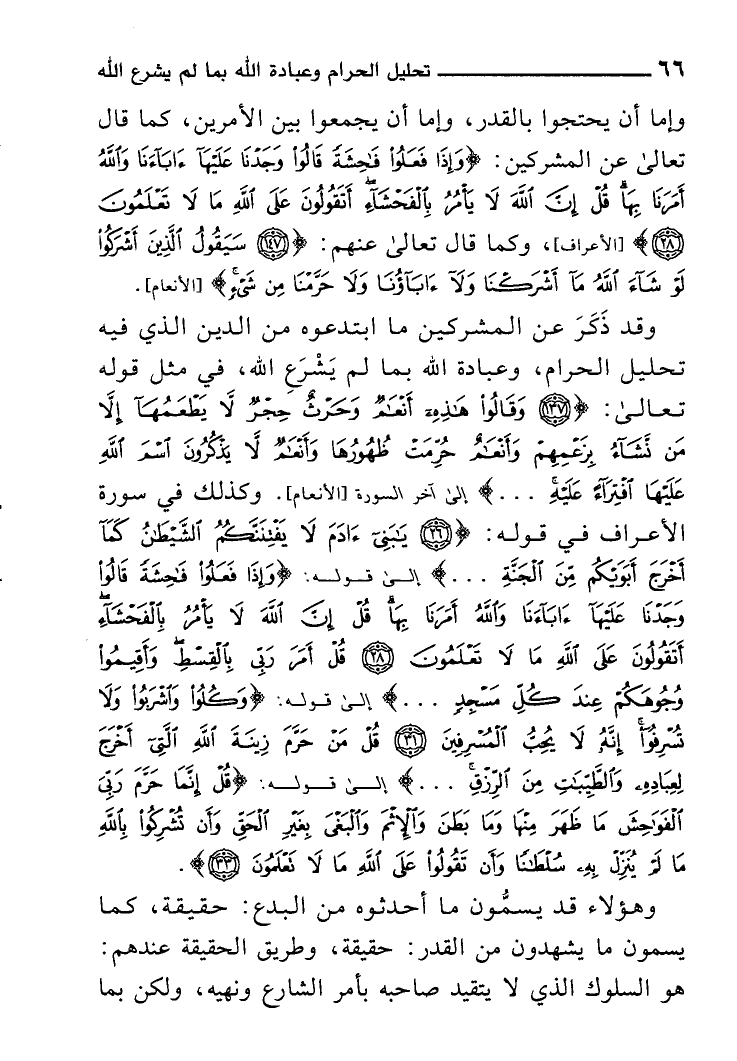وَقد ذَكَرَ عَن الْمُشْركين مَا ابتدعوه من الدَّين الَّذِي فِيهِ تَحْلِيل الْحَرَام وَعبادَة الله بِمَا لم يشرع الله فِي مثل قَوْله تَعَالَى [138 الْأَنْعَام] : {وَقَالُوا هَذِه أنعام وحرث حجر لَا يطْعمهَا إِلَّا من نشَاء بزعمهم وأنعام حرمت ظُهُورهَا وأنعام لَا يذكرُونَ اسْم الله عَلَيْهَا افتراء عَلَيْهِ} إِلَى آخر السُّورَة وَكَذَلِكَ فِي سُورَة الْأَعْرَاف [27-33] : {يَا بني آدم لَا يفتننكم الشَّيْطَان كَمَا أخرج أبويكم من الْجنَّة} إِلَى قَوْله: {وَإِذا فعلوا فَاحِشَة قَالُوا وجدنَا عَلَيْهَا آبَاءَنَا وَالله أمرنَا بهَا قل إِن الله لَا يَأْمر بالفحشاء أتقولون على الله مَا لَا تعلمُونَ * قل أَمر رَبِّي بِالْقِسْطِ وَأقِيمُوا وُجُوهكُم عِنْد كل مَسْجِد} إِلَى قَوْله: {وكلوا وَاشْرَبُوا وَلَا تسرفوا إِنَّه لَا يحب المسرفين * قل من حرم زِينَة الله الَّتِي أخرج لِعِبَادِهِ والطيبات من الرزق} إِلَى قَوْله: {قل إِنَّمَا حرم رَبِّي الْفَوَاحِش مَا ظهر مِنْهَا وَمَا بطن وَالْإِثْم وَالْبَغي بِغَيْر الْحق وَأَن تُشْرِكُوا بِاللَّه مَا لم ينزل بِهِ سُلْطَانا وَأَن تَقولُوا على الله مَا لَا تعلمُونَ} .