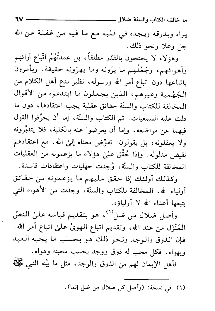 وأصل ضلال من ضل هُوَ بِتَقْدِيم قِيَاسه على النَّص الْمنزل من عِنْد الله وَتَقْدِيم اتِّبَاع الْهوى على اتِّبَاع أَمر الله فَإِن الذَّوْق والوجد وَنَحْو ذَلِك هُوَ بِحَسب مَا يُحِبهُ العَبْد ويهواه فَكل محب لَهُ ذوق وَوجد بِحَسب محبته وهواه.