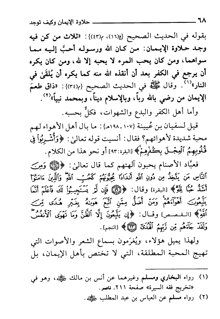 بقوله فِي الحَدِيث الصَّحِيح: " ثَلَاث من كن فِيهِ وجد حلاوة الْإِيمَان: من كَانَ الله وَرَسُوله أحب إِلَيْهِ مِمَّا سواهُمَا وَمن كَانَ يحب الْمَرْء لَا يُحِبهُ إِلَّا لله وَمن كَانَ يكره أَن يرجع فِي الْكفْر بعد إِذْ أنقذه الله مِنْهُ كَمَا يكره أَن يلقى فِي النَّار " وَقَالَ صلى الله عَلَيْهِ وَسلم: " ذاق طعم الْإِيمَان من رَضِي بِاللَّه رَبًّا وَبِالْإِسْلَامِ دينا وَبِمُحَمَّدٍ نَبيا ".