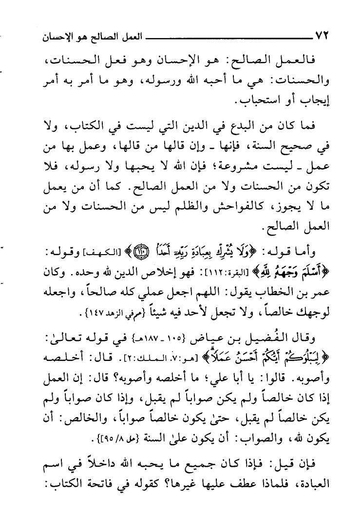 وَقَالَ الفضيل بن عِيَاض فِي قَوْله تَعَالَى [7 هود، 2 الْملك] : {ليَبْلُوكُمْ أَيّكُم أحسن عملا} قَالَ: أخلصه وأصوبه قَالُوا: يَا أَبَا عَليّ مَا أخلصه وأصوبه؟ قَالَ: إِن الْعَمَل إِذا كَانَ خَالِصا وَلم يكن صَوَابا لم يقبل وَإِذا كَانَ صَوَابا وَلم يكن خَالِصا لم يقبل حَتَّى يكون خَالِصا صَوَابا والخالص أَن يكون لله وَالصَّوَاب أَن يكون على السّنة.
