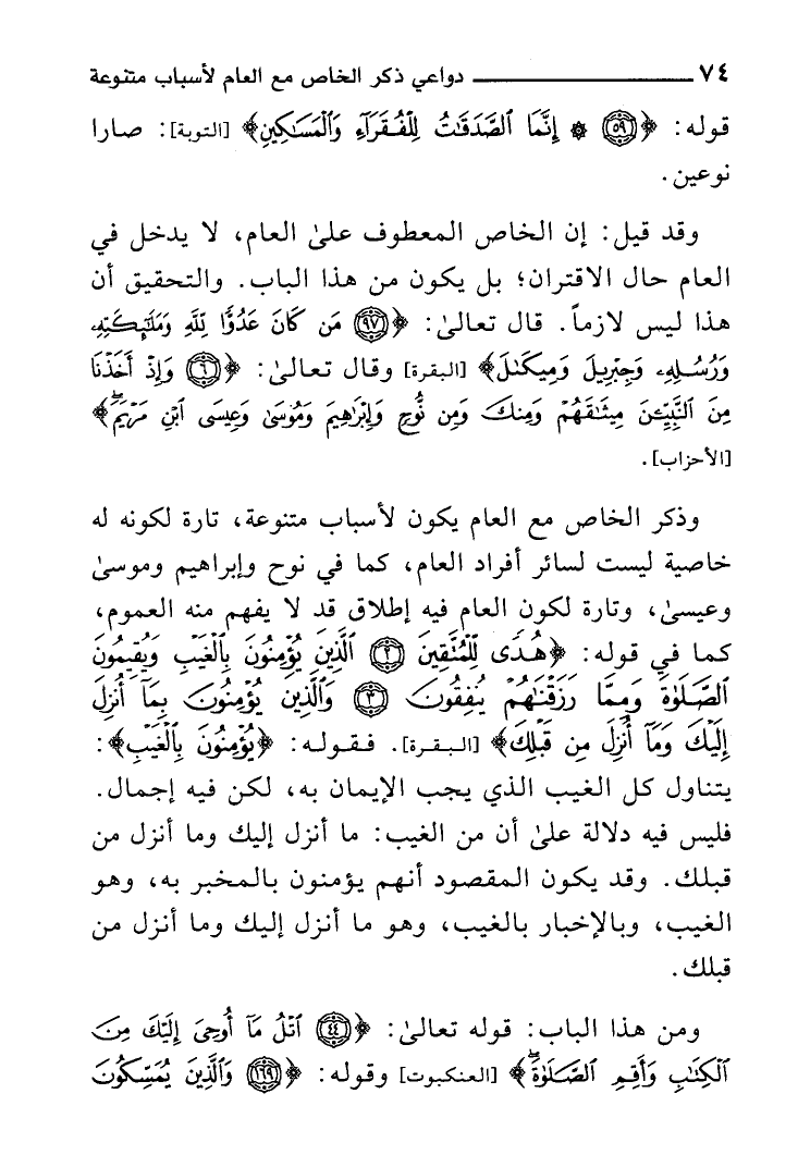 وَذكر الْخَاص مَعَ الْعَام يكون لأسباب متنوعة: تَارَة لكَونه لَهُ خاصية لَيست لسَائِر أَفْرَاد الْعَام كَمَا فِي نوح وَإِبْرَاهِيم ومُوسَى وَعِيسَى وَتارَة لكَون الْعَام فِيهِ إِطْلَاق قد لَا يفهم مِنْهُ الْعُمُوم كَمَا فِي قَوْله [2-4 الْبَقَرَة] : {هدى لِلْمُتقين * الَّذين يُؤمنُونَ بِالْغَيْبِ ويقيمون الصَّلَاة وَمِمَّا رَزَقْنَاهُمْ يُنْفقُونَ * وَالَّذين يُؤمنُونَ بِمَا أنزل إِلَيْك وَمَا أنزل من قبلك} فَقَوله: {يُؤمنُونَ بِالْغَيْبِ} يتَنَاوَل كل الْغَيْب الَّذِي يجب الْإِيمَان بِهِ لَكِن فِيهِ إِجْمَال فَلَيْسَ فِيهِ دلَالَة على أَن من الْغَيْب {مَا أنزل إِلَيْك وَمَا أنزل من قبلك} وَقد يكون الْمَقْصُود أَنهم يُؤمنُونَ بالمخبر بِهِ وَهُوَ الْغَيْب وبالإخبار بِالْغَيْبِ وَهُوَ {مَا أنزل إِلَيْك وَمَا أنزل من قبلك} .