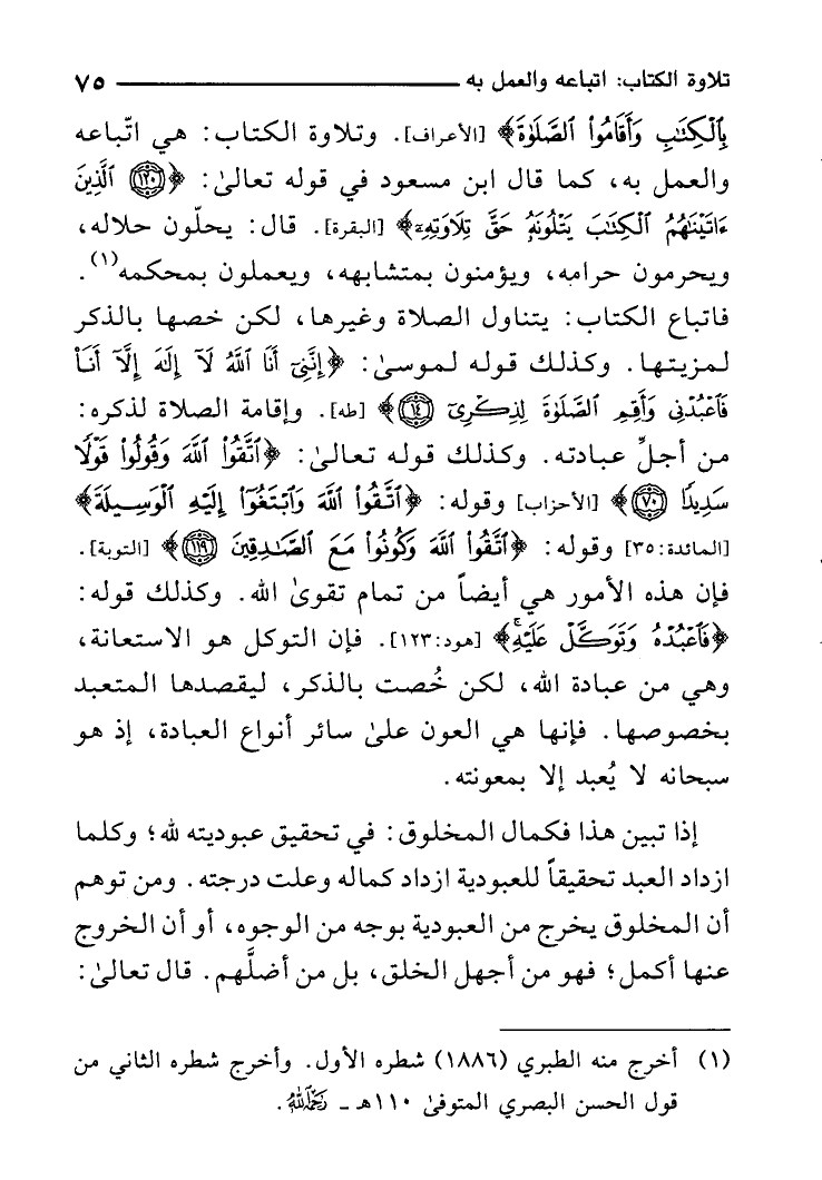 بِالْكتاب وَأَقَامُوا الصَّلَاة} وتلاوة الْكتاب هِيَ اتِّبَاعه وَالْعَمَل بِهِ كَمَا قَالَ ابْن مَسْعُود فِي قَوْله تَعَالَى [121 الْبَقَرَة] : {الَّذين آتَيْنَاهُم الْكتاب يتلونه حق تِلَاوَته} قَالَ: يحلّون حَلَاله ويحرمون حرَامه ويؤمنون بمتشابهه ويعملون بمحكمه. فاتباع الْكتاب يتَنَاوَل الصَّلَاة وَغَيرهَا لَكِن خصها بِالذكر لمزيتها وَكَذَلِكَ قَوْله لمُوسَى [14 طه] : {إِنَّنِي أَنا الله لَا إِلَه إِلَّا أَنا فاعبدني وأقم الصَّلَاة لذكري} وَإِقَامَة الصَّلَاة لذكره من أجلِّ عِبَادَته وَكَذَلِكَ قَوْله تَعَالَى [70 الْأَحْزَاب] : {اتَّقوا الله وَقُولُوا قولا سديدا} وَقَوله [35 الْمَائِدَة] : {اتَّقوا الله وابتغوا إِلَيْهِ الْوَسِيلَة} وَقَوله [119 التَّوْبَة] : {اتَّقوا الله وَكُونُوا مَعَ الصَّادِقين} فَإِن هَذِه الْأُمُور هِيَ أَيْضا من تَمام تقوى الله وَكَذَلِكَ قَوْله [123 هود] : {فاعبده وتوكل عَلَيْهِ} فَإِن التَّوَكُّل هُوَ الِاسْتِعَانَة وَهِي من عبَادَة الله لَكِن خصت بِالذكر ليقصدها المتعبد بخصوصها فَإِنَّهَا هِيَ العون على سَائِر أَنْوَاع الْعِبَادَة إِذْ هُوَ سُبْحَانَهُ لَا يُعبد إِلَّا بمعونته.