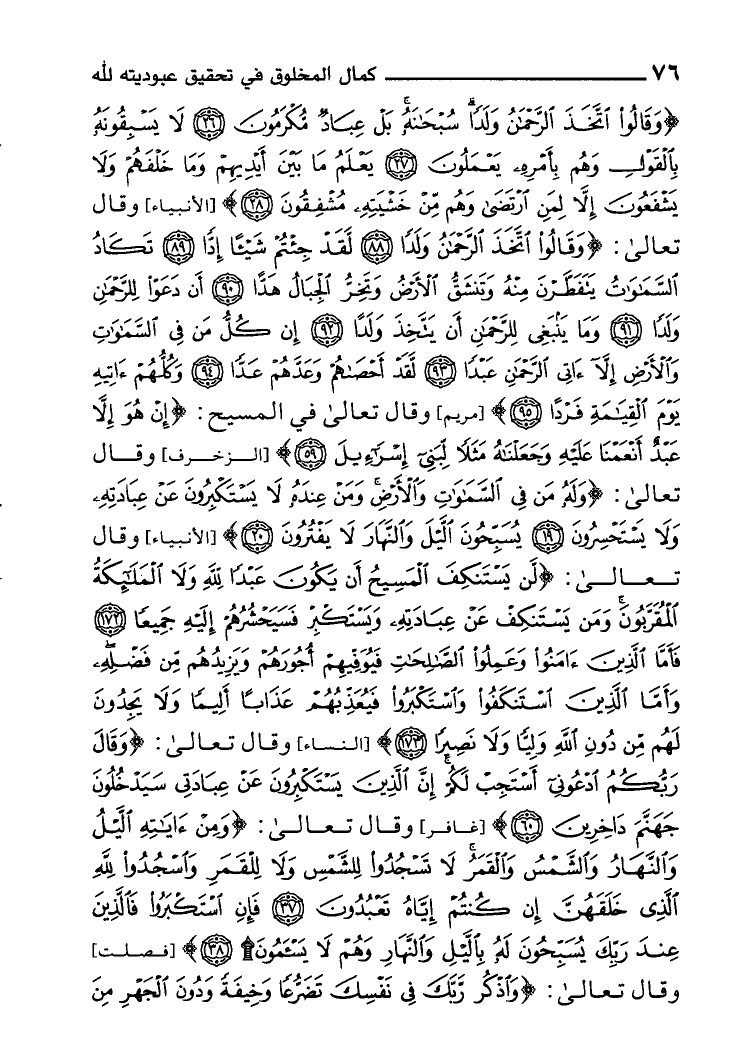 {وَقَالُوا اتخذ الرَّحْمَن ولدا سُبْحَانَهُ بل عباد مكرمون * لَا يسبقونه بالْقَوْل وهم بأَمْره يعْملُونَ * يعلم مَا بَين أَيْديهم وَمَا خَلفهم وَلَا يشفعون إِلَّا لمن ارتضى وهم من خَشيته مشفقون} وَقَالَ تَعَالَى [88-95 مَرْيَم] : {وَقَالُوا اتخذ الرَّحْمَن ولدا * لقد جئْتُمْ شَيْئا إدا * تكَاد السَّمَاوَات يتفطرن مِنْهُ وتنشق الأَرْض وتخر الْجبَال هدا * أَن دعوا للرحمن ولدا * وَمَا يَنْبَغِي للرحمن أَن يتَّخذ ولدا * إِن كل من فِي السَّمَاوَات وَالْأَرْض إِلَّا آتِي الرَّحْمَن عبدا * لقد أحصاهم وعدهم عدا * وَكلهمْ آتيه يَوْم الْقِيَامَة فَردا} وَقَالَ تَعَالَى فِي الْمَسِيح [59 الزخرف] : {إِن هُوَ إِلَّا عبد أنعمنا عَلَيْهِ وجعلناه مثلا لبني إِسْرَائِيل} وَقَالَ تَعَالَى [19-20 الْأَنْبِيَاء] : {وَله من فِي السَّمَاوَات وَالْأَرْض وَمن عِنْده لَا يَسْتَكْبِرُونَ عَن عِبَادَته وَلَا يستحسرون * يسبحون اللَّيْل وَالنَّهَار لَا يفترون} وَقَالَ تَعَالَى [172-173 النِّسَاء] : {لن يستنكف الْمَسِيح أَن يكون عبدا لله وَلَا الْمَلَائِكَة المقربون وَمن يستنكف عَن عِبَادَته ويستكبر فسيحشرهم إِلَيْهِ جَمِيعًا * فَأَما الَّذين آمنُوا وَعمِلُوا الصَّالِحَات فيوفيهم أُجُورهم ويزيدهم من فَضله وَأما الَّذين استنكفوا واستكبروا فيعذبهم عذَابا أَلِيمًا وَلَا يَجدونَ لَهُم من دون الله وليا وَلَا نَصِيرًا} وَقَالَ تَعَالَى [60 غَافِر] : {وَقَالَ ربكُم ادْعُونِي أَسْتَجِب لكم إِن الَّذين يَسْتَكْبِرُونَ عَن عبادتي سيدخلون جَهَنَّم داخرين} وَقَالَ تَعَالَى [37-38 فصلت] : {وَمن آيَاته اللَّيْل وَالنَّهَار وَالشَّمْس وَالْقَمَر لَا تسجدوا للشمس وَلَا للقمر واسجدوا لله الَّذِي خَلقهنَّ إِن كُنْتُم إِيَّاه تَعْبدُونَ * فَإِن استكبروا فَالَّذِينَ عِنْد رَبك يسبحون لَهُ بِاللَّيْلِ وَالنَّهَار وهم لَا يسأمون} وَقَالَ تَعَالَى [205-206 الْأَعْرَاف] : {وَاذْكُر رَبك فِي نَفسك تضرعا وخيفة وَدون الْجَهْر من
