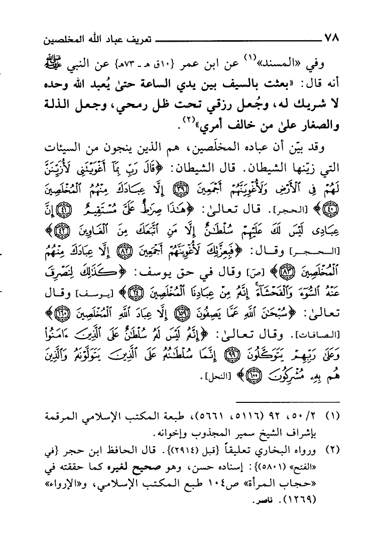 وَقد بَين أَن عباده المخلصين هم الَّذين ينجون من السَّيِّئَات الَّتِي زيّنها الشَّيْطَان قَالَ الشَّيْطَان [39-40 الْحجر] : {قَالَ رب بِمَا أغويتني لأزينن لَهُم فِي الأَرْض ولأغوينهم أَجْمَعِينَ * إِلَّا عِبَادك مِنْهُم المخلصين} قَالَ تَعَالَى [41-42 الْحجر] : {هَذَا صِرَاط عَليّ مُسْتَقِيم * إِن عبَادي لَيْسَ لَك عَلَيْهِم سُلْطَان إِلَّا من اتبعك من الغاوين} وَقَالَ [82-83 ص] : {فبعزتك لأغوينهم أَجْمَعِينَ * إِلَّا عِبَادك مِنْهُم المخلصين} وَقَالَ فِي حق يُوسُف [24 يُوسُف] : {كَذَلِك لنصرف عَنهُ السوء والفحشاء إِنَّه من عبادنَا المخلصين} وَقَالَ تَعَالَى [159-160 الصافات] : {سُبْحَانَ الله عَمَّا يصفونَ * إِلَّا عباد الله المخلصين} وَقَالَ تَعَالَى [99-100 النَّحْل] : {إِنَّه لَيْسَ لَهُ سُلْطَان على الَّذين آمنُوا وعَلى رَبهم يَتَوَكَّلُونَ * إِنَّمَا سُلْطَانه على الَّذين يتولونه وَالَّذين هم بِهِ مشركون} .