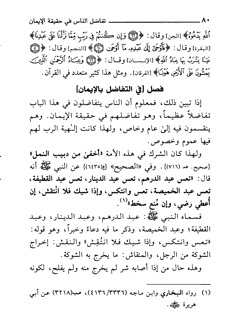 وَلِهَذَا كَانَ الشّرك فِي هَذِه الْأمة " أخْفى من دَبِيب النَّمْل ". وَفِي " الصَّحِيح " عَن النَّبِي صلى الله عَلَيْهِ وَسلم أَنه قَالَ: " تعس عبد الدِّرْهَم تعس عبد الدِّينَار تعس عبد القطيفة تعس عبد الخميصة تعس وانتكس وَإِذا شيك فَلَا انتقش إِن أعطي رَضِي وَإِن منع سخط ".