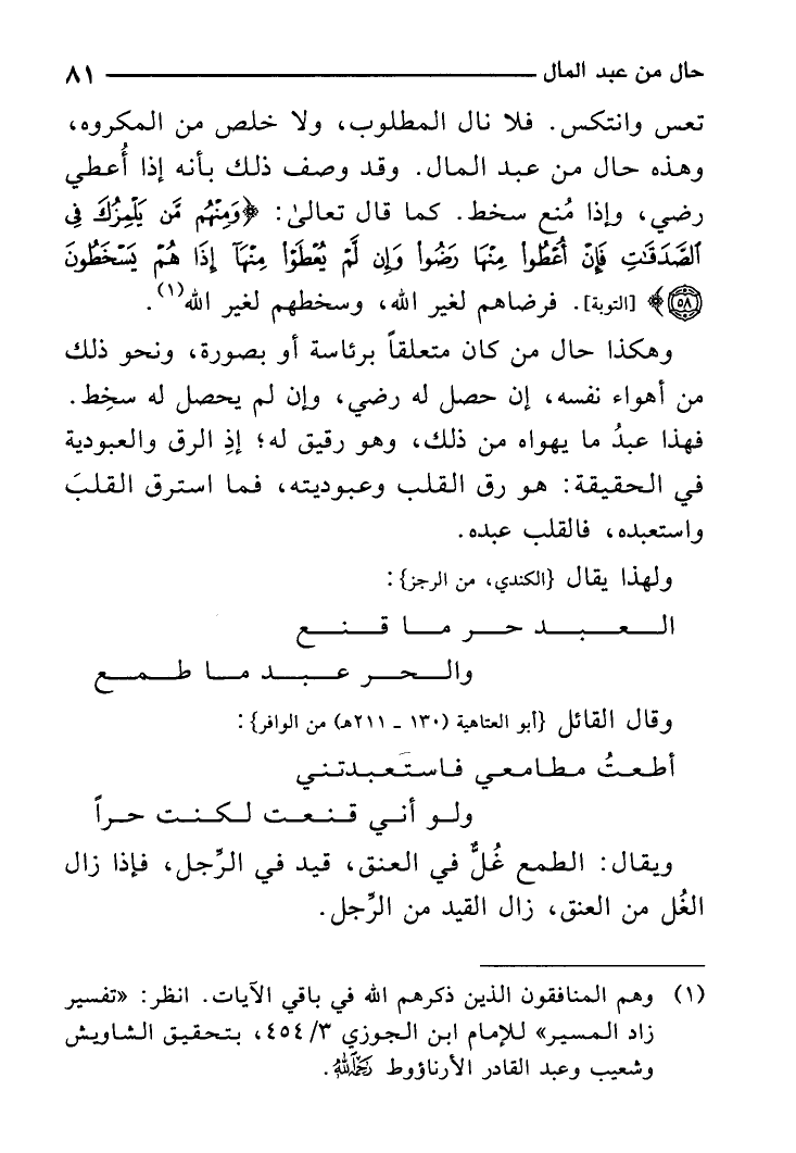 وَهَكَذَا حَال من كَانَ مُتَعَلقا برئاسة أَو بِصُورَة - وَنَحْو ذَلِك من أهواء نَفسه - إِن حصل لَهُ رَضِي وَإِن لم يحصل لَهُ سخط فَهَذَا عبد مَا يهواه من ذَلِك وَهُوَ رَقِيق لَهُ إِذْ الرّقّ والعبودية فِي الْحَقِيقَة هُوَ رق الْقلب وعبوديته فَمَا اسْترق الْقلب واستعبده فَهُوَ عَبده.