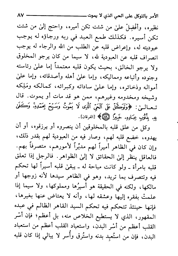 وكل من علق قلبه بالمخلوقين أَن ينصروه أَو يرزقوه أَو أَن يهدوه خضع قلبه لَهُم وَصَارَ فِيهِ من الْعُبُودِيَّة لَهُم بِقدر ذَلِك وَإِن كَانَ فِي الظَّاهِر أَمِيرا لَهُم مُدبرا لأمورهم متصرفا بهم فالعاقل ينظر إِلَى الْحَقَائِق لَا إِلَى الظَّوَاهِر فالرجل إِذا تعلق قلبه بِامْرَأَة وَلَو كَانَت مُبَاحَة لَهُ يبْقى قلبه أَسِيرًا لَهَا تحكم فِيهِ وتتصرف بِمَا تُرِيدُ وَهُوَ فِي الظَّاهِر سَيِّدهَا لِأَنَّهُ زَوجهَا أَو مَالِكهَا وَلكنه فِي الْحَقِيقَة هُوَ أَسِيرهَا ومملوكها وَلَا سِيمَا إِذا علمت بفقرة إِلَيْهَا وعشقه لَهَا وَأَنه لَا يعتاض عَنْهَا بغَيْرهَا فَإِنَّهَا حِينَئِذٍ تتحكم فِيهِ تحكم السَّيِّد القاهر الظَّالِم فِي عَبده المقهور الَّذِي لَا يَسْتَطِيع الْخَلَاص مِنْهُ بل أعظم فَإِن أسر الْقلب أعظم من أسر الْبدن واستعباد الْقلب أعظم من استعباد الْبدن فَإِن من استبعد بدنه واسترق وَأسر لَا يُبَالِي إِذا كَانَ قلبه