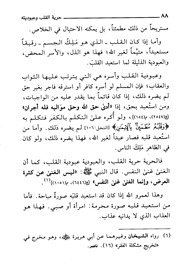 وعبودية الْقلب وأسره هِيَ الَّتِي يَتَرَتَّب عَلَيْهَا الثَّوَاب وَالْعِقَاب فَإِن الْمُسلم لَو أسره كَافِر أَو استرقه فَاجر بِغَيْر حق لم يضرّهُ ذَلِك إِذا كَانَ قَائِما بِمَا يقدر عَلَيْهِ من الْوَاجِبَات وَمن استعبد بِحَق إِذا " أدّى حق الله وَحقّ موَالِيه فَلهُ أَجْرَانِ " وَلَو أكره على التَّكَلُّم بالْكفْر فَتكلم بِهِ وَقَلبه مطمئن بِالْإِيمَان لم يضرّهُ ذَلِك وَأما من استُعبد قلبه فَصَارَ عبدا لغير الله فَهَذَا يضرّهُ ذَلِك وَلَو كَانَ فِي الظَّاهِر ملك النَّاس.