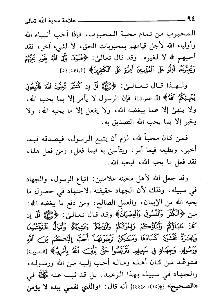 وَقد جعل الله لأهل محبته علامتين: اتِّبَاع الرَّسُول وَالْجهَاد فِي سَبيله وَذَلِكَ لِأَن الْجِهَاد حَقِيقَة الِاجْتِهَاد فِي حُصُول مَا يُحِبهُ الله من الْإِيمَان وَالْعَمَل الصَّالح وَمن دفع مَا يبغضه الله من الْكفْر والفسوق والعصيان وَقد قَالَ تَعَالَى [24 التَّوْبَة] : {قل إِن كَانَ آباؤكم وأبناؤكم وَإِخْوَانكُمْ وأزواجكم وعشيرتكم وأموال اقترفتموها وتجارة تخشون كسادها ومساكن ترضونها أحب إِلَيْكُم من الله وَرَسُوله وَجِهَاد فِي سَبيله فتربصوا حَتَّى يَأْتِي الله بأَمْره} فتوعد من كَانَ أَهله وَمَاله أحب إِلَيْهِ من الله وَرَسُوله وَالْجهَاد فِي سَبيله بِهَذَا الْوَعيد بل قد ثَبت عَنهُ صلى الله عَلَيْهِ وَسلم فِي " الصَّحِيح " أَنه قَالَ: " وَالَّذِي نَفسِي بِيَدِهِ لَا يُؤمن