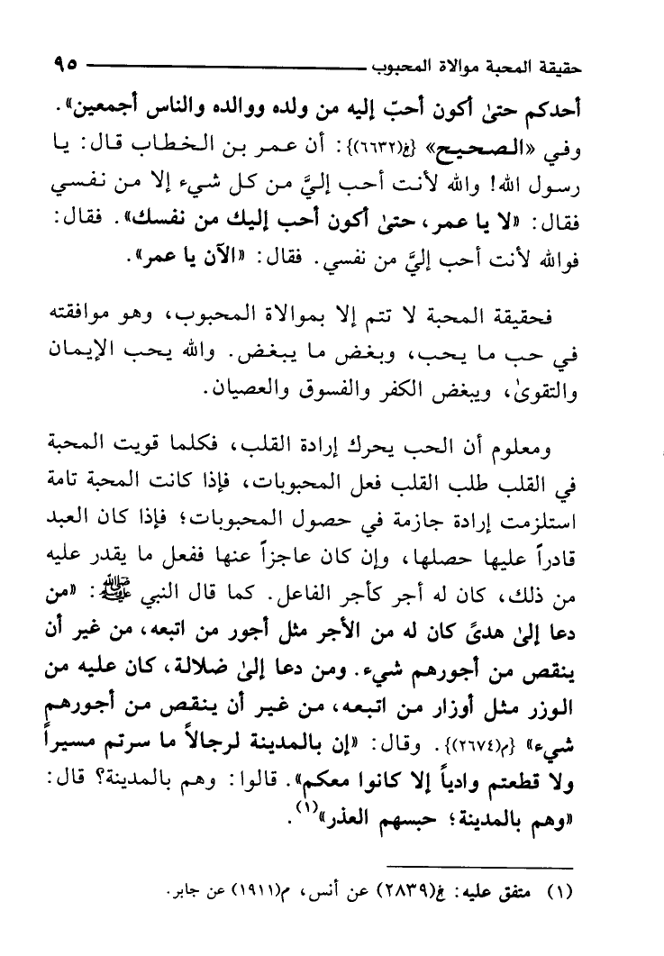 وَمَعْلُوم أَن الْحبّ يُحَرك إِرَادَة الْقلب فَكلما قويت الْمحبَّة فِي الْقلب طلب الْقلب فعل المحبوبات فَإِذا كَانَت الْمحبَّة تَامَّة استلزمت إِرَادَة جازمة فِي حُصُول المحبوبات فَإِذا كَانَ العَبْد قَادر عَلَيْهَا حصلها وَإِن كَانَ عَاجِزا عَنْهَا فَفعل مَا يقدر عَلَيْهِ من ذَلِك كَانَ لَهُ أجر كَأَجر الْفَاعِل كَمَا قَالَ النَّبِي صلى الله عَلَيْهِ وَسلم: " من دَعَا إِلَى هدى كَانَ لَهُ من الْأجر مثل أجور من اتبعهُ من غير أَن ينقص من أُجُورهم شَيْء وَمن دَعَا إِلَى ضَلَالَة كَانَ عَلَيْهِ من الْوزر مثل أوزار من اتبعهُ من غير أَن ينقص من أُجُورهم شَيْء ". وَقَالَ: " إِن بِالْمَدِينَةِ لَرِجَالًا مَا سِرْتُمْ مسيرًا وَلَا قطعْتُمْ وَاديا إِلَّا كَانُوا مَعكُمْ " قَالُوا: وهم بِالْمَدِينَةِ؟ قَالَ: " وهم بِالْمَدِينَةِ حَبسهم الْعذر ".
