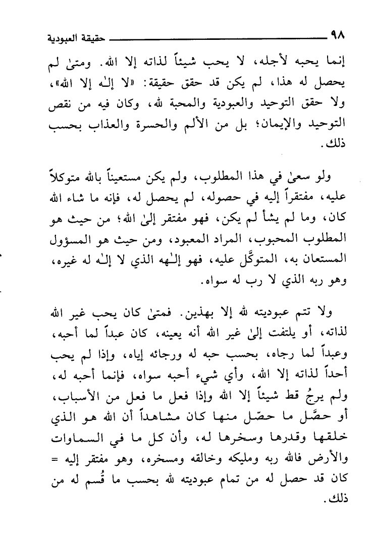 وَلَا تتمّ عبوديته لله إِلَّا بِهَذَيْنِ فَمَتَى كَانَ يحب غير الله لذاته أَو يلْتَفت إِلَى غير الله أَنه يُعينهُ كَانَ عبدا لما أحبه وعبدا لما رجاه بِحَسب حبه لَهُ ورجائه إِيَّاه وَإِذا لم يحب أحدا لذاته إِلَّا الله وَأي شَيْء أحبه سواهُ فَإِنَّمَا أحبه لَهُ وَلم يرج قطّ شَيْئا إِلَّا الله وَإِذا فعل مَا فعل من الْأَسْبَاب أَو حصل مَا حصل مِنْهَا كَانَ مشاهدا أَن الله هُوَ الذى خلقهَا وقدرها وسخرها لَهُ وَأَن كل مَا فِي السَّمَاوَات وَالْأَرْض فَالله ربه ومليكه وخالقه ومسخره وَهُوَ مفتقر إِلَيْهِ كَانَ قد حصل لَهُ من تَمام عبوديته لله بِحَسب مَا قسم لَهُ من ذَلِك.
