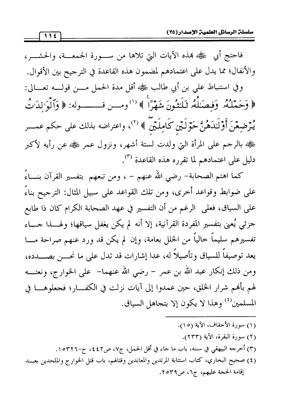 فاحتج أبي - رضي الله عنه - بهذه الآيات التي تلاها من سورة الجمعة، والحشر، والأنفال؛ مما يدل على اعتمادهم لمضمون هذه القاعدة في الترجيح بين الأقوال.