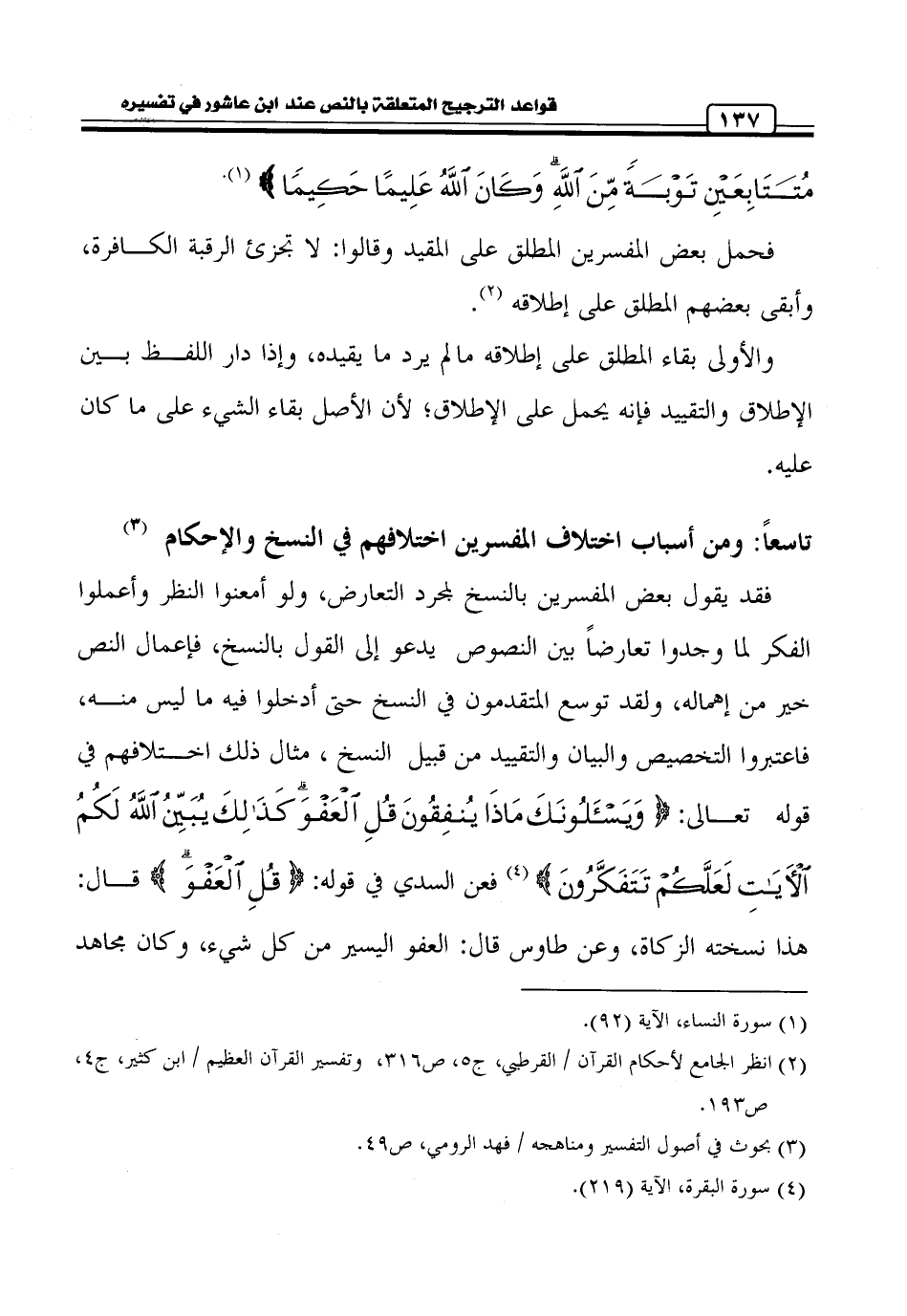 كتاب قواعد الترجيح المتعلقة بالنص عند ابن عاشور في تفسيره التحرير والتنوير