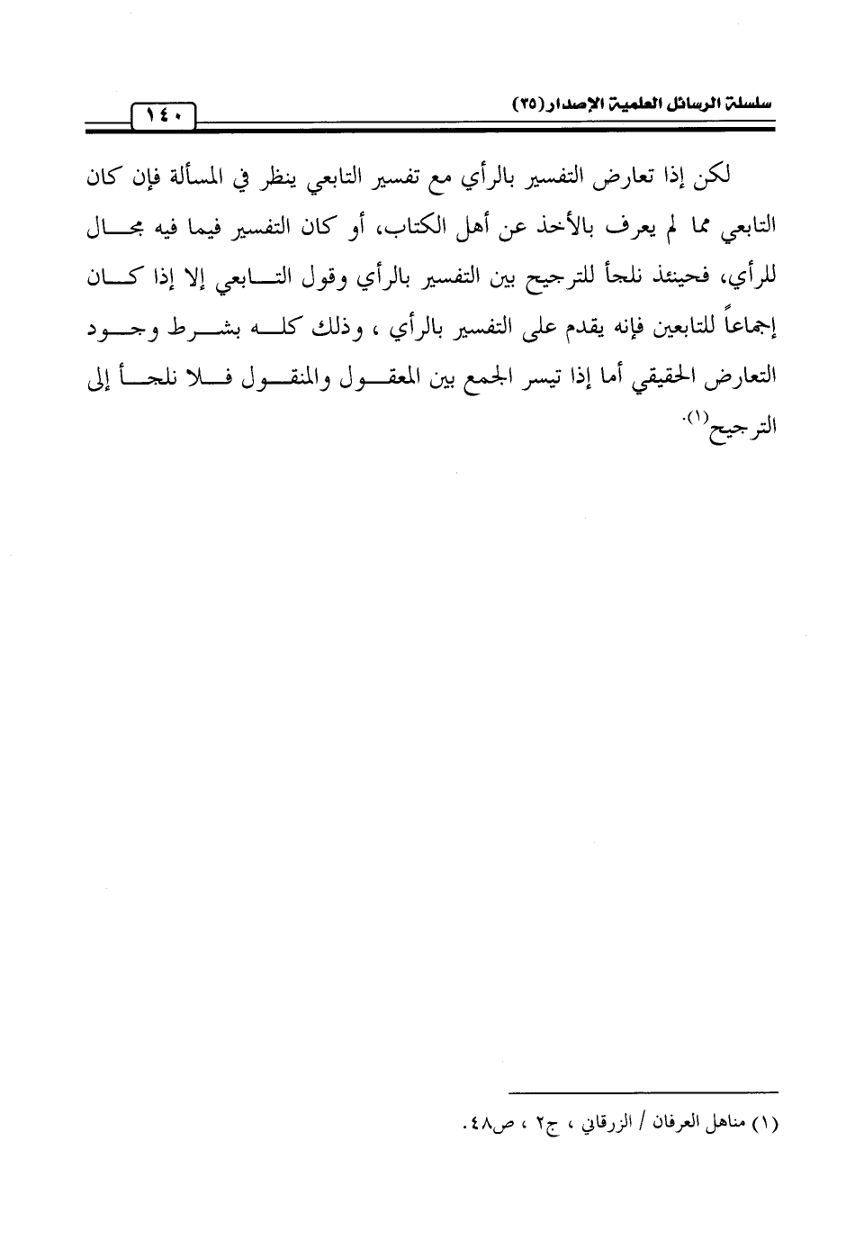 لكن إذا تعارض التفسير بالرأي مع تفسير التابعي ينظر في المسألة فإن كان التابعي مما لم يعرف بالأخذ عن أهل الكتاب أو كان التفسير في ما فيه مجال للرأي, فحينئذ نلجأ للترجيح بين التفسير بالرأي وقول التابعي إلا إذا كان إجماعا للتابعين فإنه يقدم على التفسير بالرأي , وذلك كله بشرط وجود التعارض الحقيقي أما إذا تيسر الجمع بين المعقول والمنقول فلا نلجأ إلى الترجيح (¬1).