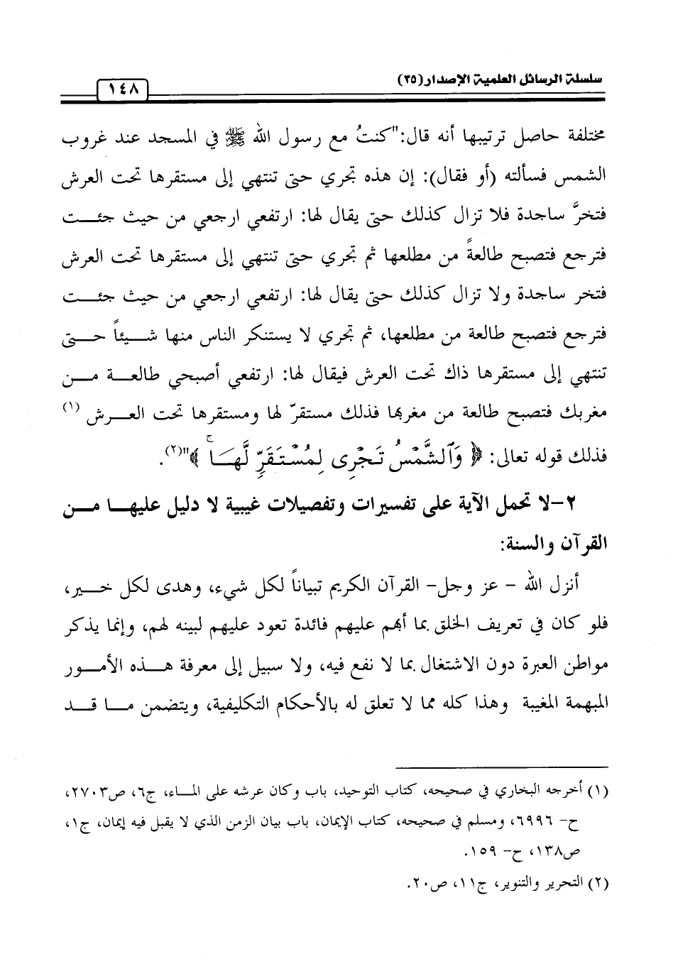 مختلفة حاصل ترتيبها أنه قال: " كنتُ مع رسول الله - صلى الله عليه وسلم - في المسجد عند غروب الشمس فسألته (أو فقال): إن هذه تجري حتى تنتهي إلى مستقرها تحت العرش فتخرَّ ساجدة فلا تزال كذلك حتى يقال لها: ارتفعي ارجعي من حيث جئت فترجع فتصبح طالعةً من مطلعها ثم تجري حتى تنتهي إلى مستقرها تحت العرش فتخر ساجدة ولا تزال كذلك حتى يقال لها: ارتفعي ارجعي من حيث جئت فترجع فتصبح طالعة من مطلعها، ثم تجري لا يستنكر الناس منها شيئاً حتى تنتهي إلى مستقرها ذاك تحت العرش فيقال لها: ارتفعي أصبحي طالعة من مغربك فتصبح طالعة من مغربها فذلك مستقرّ لها ومستقرها تحت العرش (¬1) فذلك قوله تعالى: {وَالشَّمْسُ تَجْرِي لِمُسْتَقَرٍّ لَهَا} " (¬2).