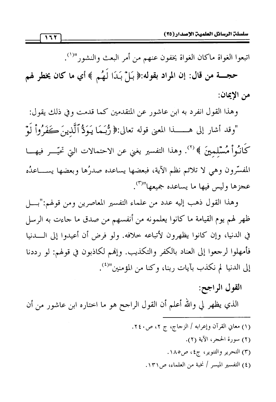 "وقد أشار إلى هذا المعنى قوله تعالى: {رُبَمَا يَوَدُّ الَّذِينَ كَفَرُوا لَوْ كَانُوا مُسْلِمِينَ} (¬2). وهذا التفسير يغني عن الاحتمالات التي تحيّر فيها المفسّرون وهي لا تلائم نظم الآية، فبعضها يساعده صدرُها وبعضها يساعدُه عجزها وليس فيها ما يساعده جميعها " (¬3).
