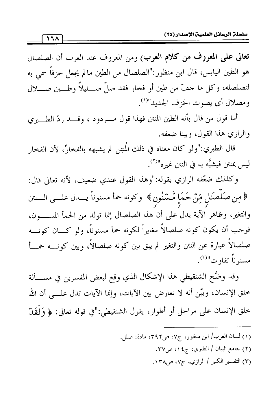 تعالى على المعروف من كلام العرب) ومن المعروف عند العرب أن الصلصال هو الطين اليابس، قال ابن منظور: " الصلصال من الطين مالم يجعل خزفاً سمي به لتصلصله، وكل ما جفّ من طين أو فخار فقد صلّ صليلاً وطين صلال ومصلال أي يصوت الخزف الجديد " (¬1).