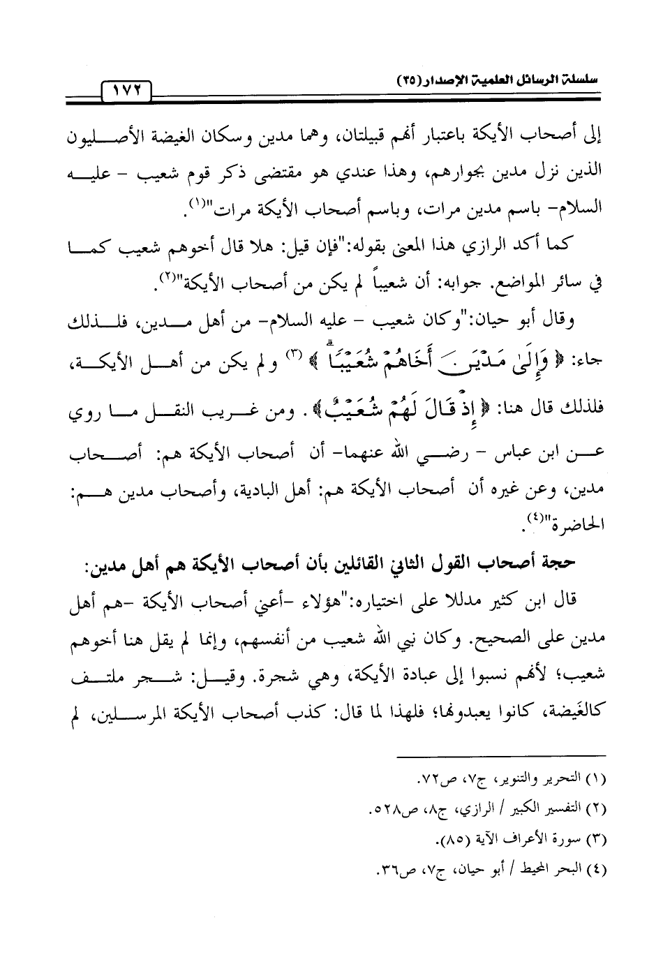 إلى أصحاب الأيكة باعتبار أنهم قبيلتان، وهما مدين وسكان الغيضة الأصليون الذين نزل مدين بجوارهم، وهذا عندي هو مقتضى ذكر قوم شعيب عليه السلام باسم مدين مرات، وباسم أصحاب الأيكة مرات " (¬1).