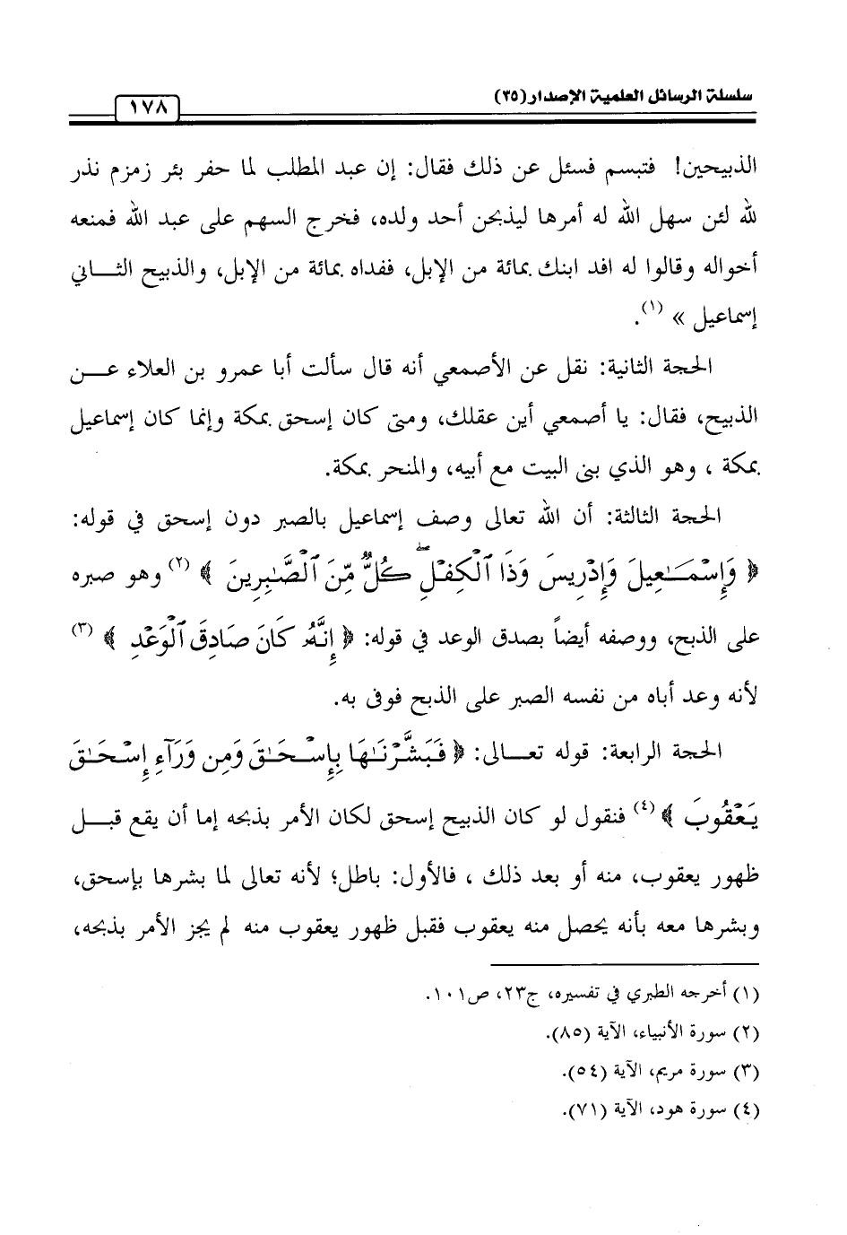 الحجة الثانية: نقل عن الأصمعي أنه قال سألت أبا عمرو بن العلاء عن الذبيح، فقال: يا أصمعي أين عقلك، ومتى كان إسحق بمكة وإنما كان إسماعيل بمكة , وهو الذي بنى البيت مع أبيه، والمنحر بمكة.