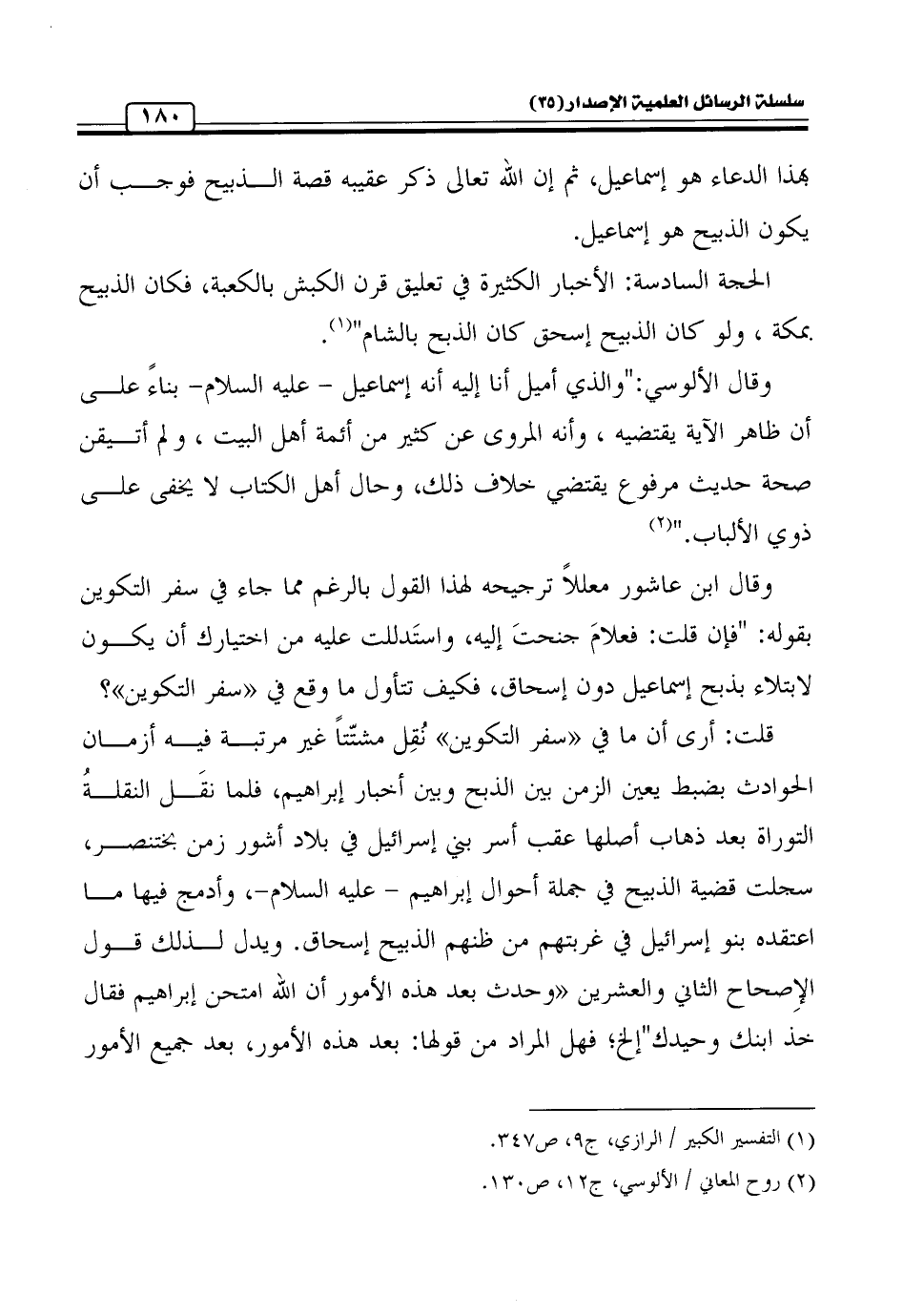 وقال الألوسي: " والذي أميل أنا إليه أنه إسماعيل عليه السلام بناءً على أن ظاهر الآية يقتضيه , وأنه المروى عن كثير من أئمة أهل البيت , ولم أتيقن صحة حديث مرفوع يقتضي خلاف ذلك، وحال أهل الكتاب لا يخفى على ذوي الألباب." (¬2)