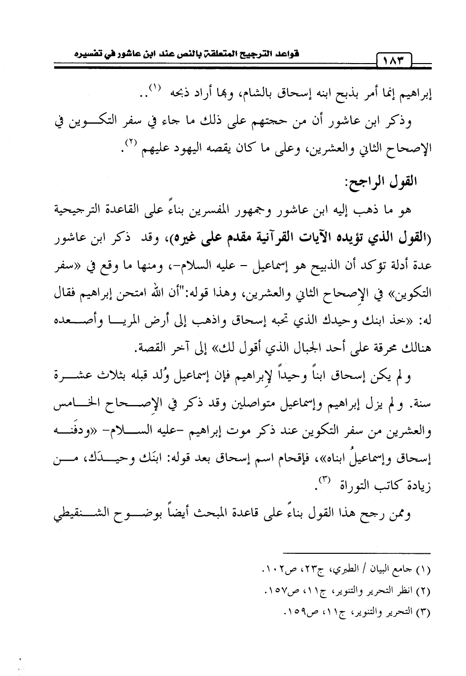 هو ما ذهب إليه ابن عاشور وجمهور المفسرين بناءً على القاعدة الترجيحية (القول الذي تؤيده الآيات القرآنية مقدم على غيره)، وقد ذكر ابن عاشور عدة أدلة تؤكد أن الذبيح هو إسماعيل عليه السلام، ومنها ما وقع في «سفر التكوين» في الإِصحاح الثاني والعشرين، وهذا قوله: " أن الله امتحن إبراهيم فقال له: «خذ ابنك وحيدك الذي تحبه إسحاق واذهب إلى أرض المريا وأصعده هنالك محرقة على أحد الجبال الذي أقول لك» إلى آخر القصة.