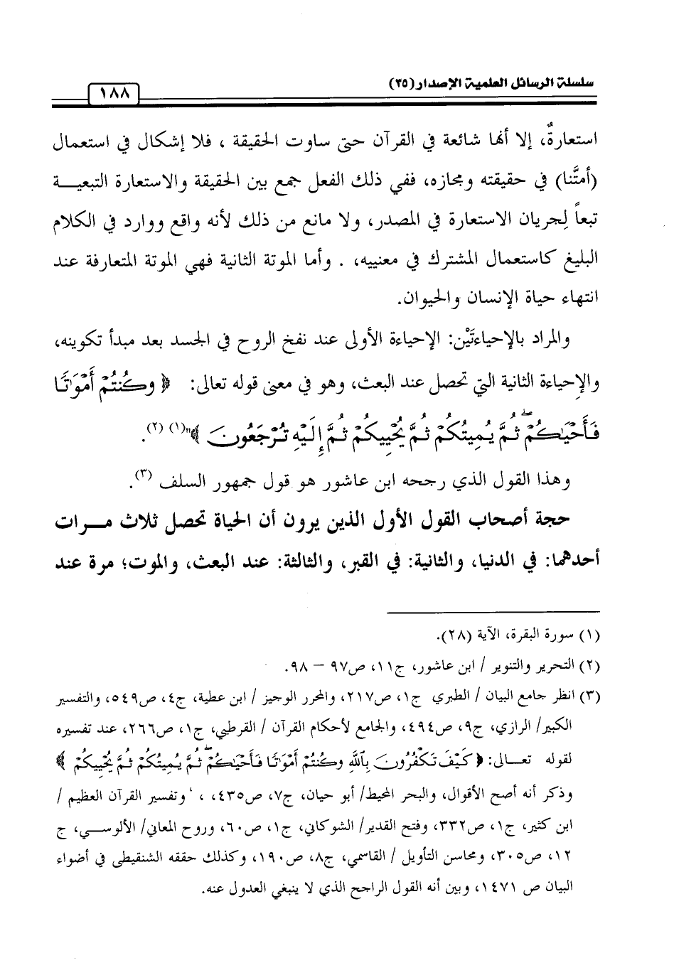 (¬3) انظر جامع البيان / الطبري ج 1، ص 217، والمحرر الوجيز / ابن عطية، ج 4، ص 549، والتفسير الكبير/ الرازي، ج 9، ص 494، والجامع لأحكام القرآن / القرطبي، ج 1، ص 266، عند تفسيره لقوله تعالى: {كَيْفَ تَكْفُرُونَ بِاللَّهِ وَكُنْتُمْ أَمْوَاتًا فَأَحْيَاكُمْ ثُمَّ يُمِيتُكُمْ ثُمَّ يُحْيِيكُمْ} وذكر أنه أصح الأقوال، والبحر المحيط/ أبو حيان، ج 7، ص 435، ، ، وتفسير القرآن العظيم / ابن كثير، ج 1، ص 332، وفتح القدير/ الشوكاني، ج 1، ص 60، وروح المعاني/ الألوسي، ج 12، ص 305، ومحاسن التأويل / القاسمي، ج 8، ص 190، وكذلك حققه الشنقيطى في أضواء البيان ص 1471، وبين أنه القول الراجح الذي لا ينبغي العدول عنه.