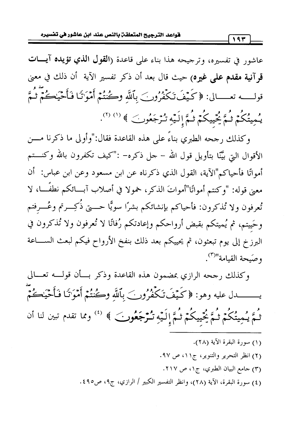وكذلك رجحه الرازي بمضمون هذه القاعدة وذكر بأن قوله تعالى يدل عليه وهو: {كَيْفَ تَكْفُرُونَ بِاللَّهِ وَكُنْتُمْ أَمْوَاتًا فَأَحْيَاكُمْ ثُمَّ يُمِيتُكُمْ ثُمَّ يُحْيِيكُمْ ثُمَّ إِلَيْهِ تُرْجَعُونَ} (¬4) ومما تقدم تبين لنا أن