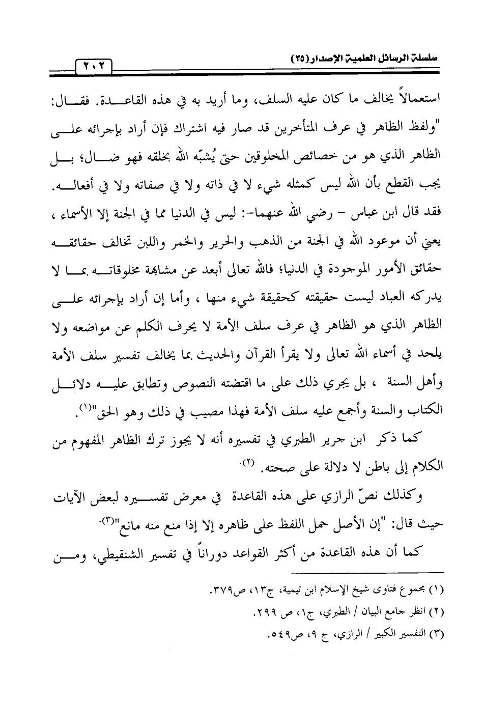 كما ذكر ابن جرير الطبري في تفسيره أنه لا يجوز ترك الظاهر المفهوم من الكلام إلى باطن لا دلالة على صحته. (¬2).