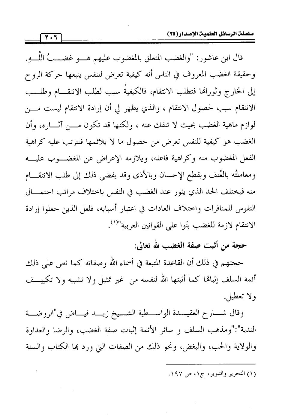 وقال شارح العقيدة الواسطية الشيخ زيد فياض في "الروضة الندية": " ومذهب السلف وسائر الأئمة إثبات صفة الغضب، والرضا والعداوة والولاية والحب، والبغض، ونحو ذلك من الصفات التي ورد بها الكتاب والسنة
