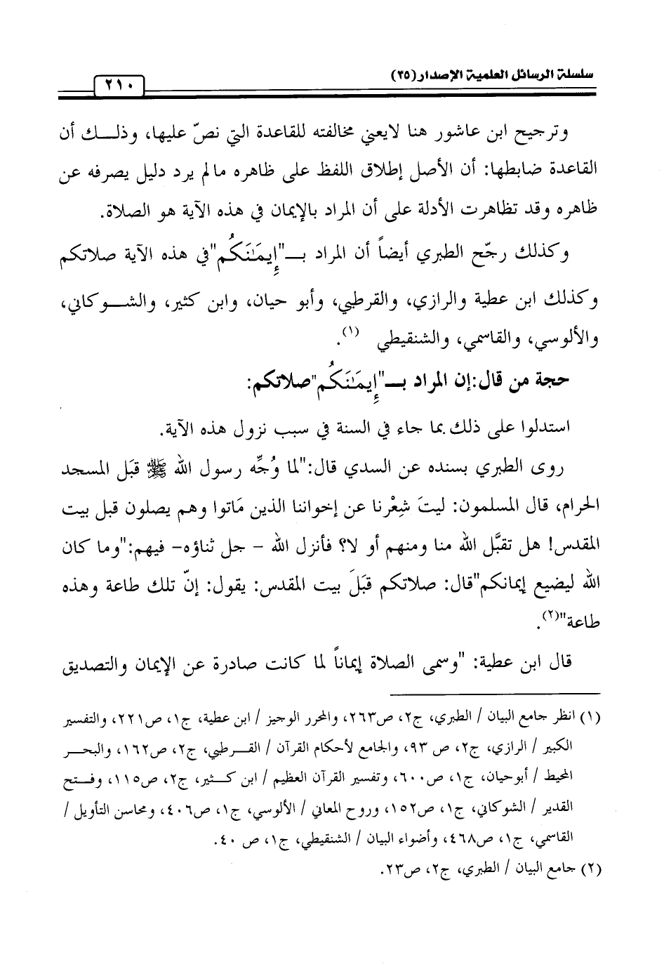 وكذلك رجّح الطبري أيضاً أن المراد بـ " إِيمَانَكُمْ " في هذه الآية صلاتكم وكذلك ابن عطية والرازي، والقرطبي، وأبو حيان، وابن كثير، والشوكاني، والألوسي، والقاسمي، والشنقيطي (¬1).