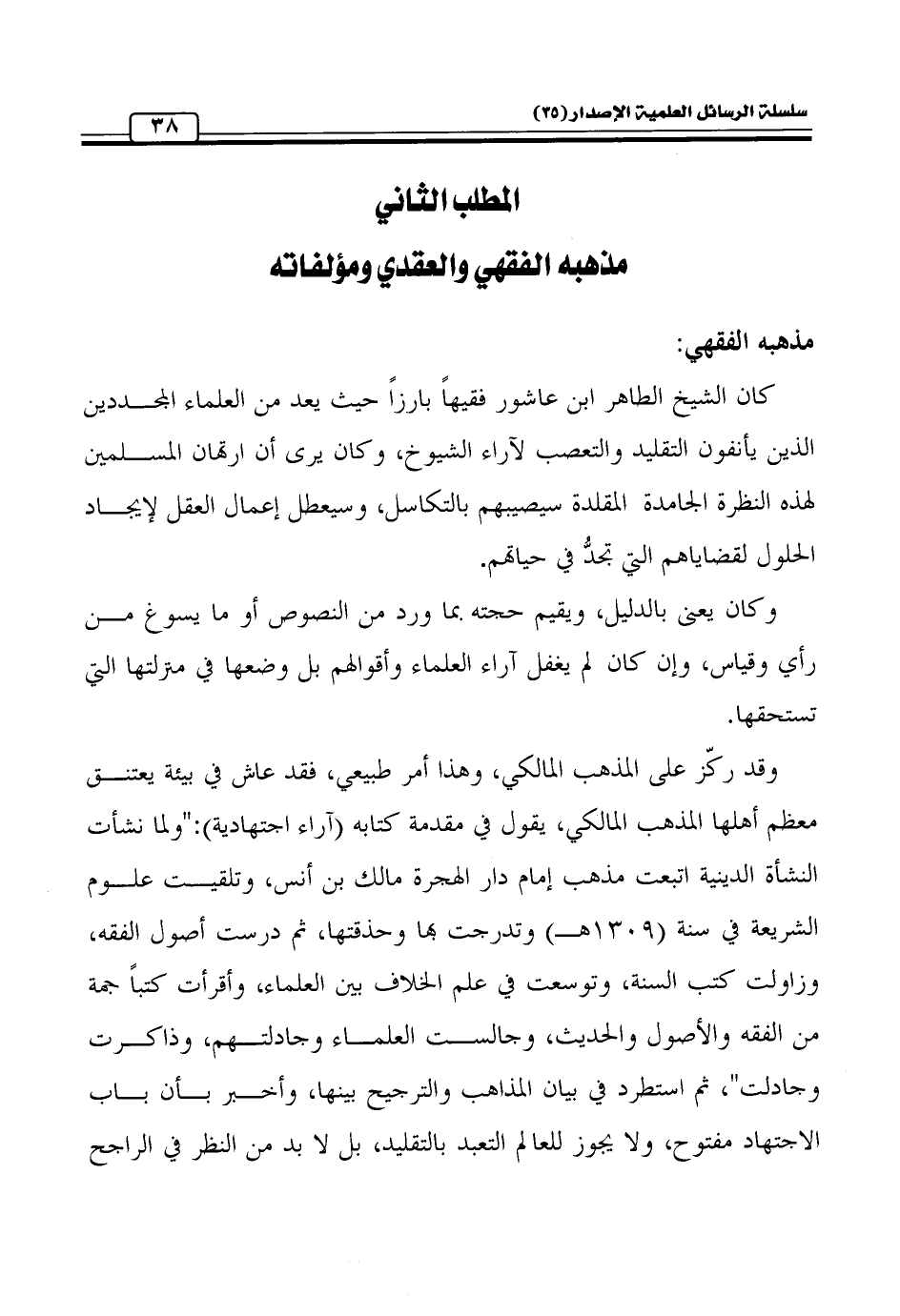 كان الشيخ الطاهر ابن عاشور فقيهاً بارزاً حيث يعد من العلماء المجددين الذين يأنفون التقليد والتعصب لآراء الشيوخ، وكان يرى أن ارتهان المسلمين لهذه النظرة الجامدة المقلدة سيصيبهم بالتكاسل، وسيعطل إعمال العقل لإيجاد الحلول لقضاياهم التي تجدُّ في حياتهم.