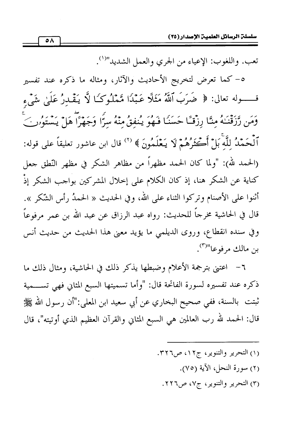 5 - كما تعرض لتخريج الأحاديث والآثار، ومثاله ما ذكره عند تفسير قوله تعالى: {ضَرَبَ اللَّهُ مَثَلًا عَبْدًا مَمْلُوكًا لَا يَقْدِرُ عَلَى شَيْءٍ وَمَنْ رَزَقْنَاهُ مِنَّا رِزْقًا حَسَنًا فَهُوَ يُنْفِقُ مِنْهُ سِرًّا وَجَهْرًا هَلْ يَسْتَوُونَ الْحَمْدُ لِلَّهِ بَلْ أَكْثَرُهُمْ لَا يَعْلَمُونَ} (¬2) قال ابن عاشور تعليقاً على قوله: (الحمد لله): " ولما كان الحمد مظهراً من مظاهر الشكر في مظهر النّطق جعل كناية عن الشكر هنا، إذ كان الكلام على إخلال المشركين بواجب الشكر إذْ أثنوا على الأصنام وتركوا الثناء على الله، وفي الحديث «الحمدُ رأس الشّكر». قال في الحاشية مخرجاً للحديث: رواه عبد الرزاق عن عبد الله بن عمر مرفوعاً وفي سنده انقطاع، وروى الديلمي ما يؤيد معنى هذا الحديث من حديث أنس بن مالك مرفوعا " (¬3).