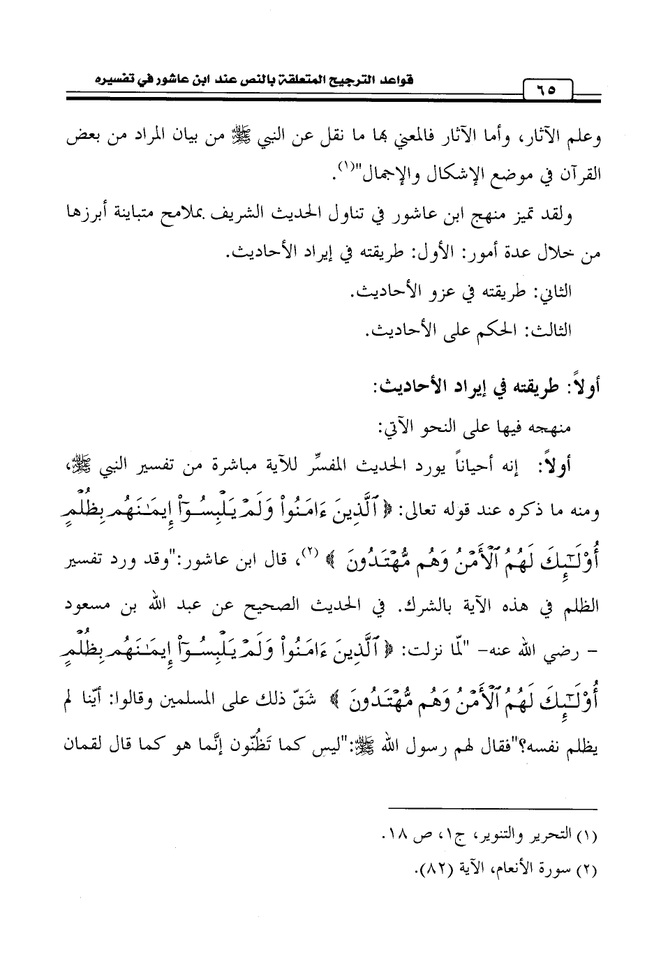 أولاً: إنه أحياناً يورد الحديث المفسِّر للآية مباشرة من تفسير النبي - صلى الله عليه وسلم -، ومنه ما ذكره عند قوله تعالى: {الَّذِينَ آمَنُوا وَلَمْ يَلْبِسُوا إِيمَانَهُمْ بِظُلْمٍ أُولَئِكَ لَهُمُ الْأَمْنُ وَهُمْ مُهْتَدُونَ} (¬2)، قال ابن عاشور: " وقد ورد تفسير الظلم في هذه الآية بالشرك. في الحديث الصحيح عن عبد الله بن مسعود رضي الله عنه" لمّا نزلت: {الَّذِينَ آمَنُوا وَلَمْ يَلْبِسُوا إِيمَانَهُمْ بِظُلْمٍ أُولَئِكَ لَهُمُ الْأَمْنُ وَهُمْ مُهْتَدُونَ} شَقّ ذلك على المسلمين وقالوا: أيّنا لم يظلم نفسه؟ " فقال لهم رسول الله - صلى الله عليه وسلم -: " ليس كما تَظُنّون إنَّما هو كما قال لقمان