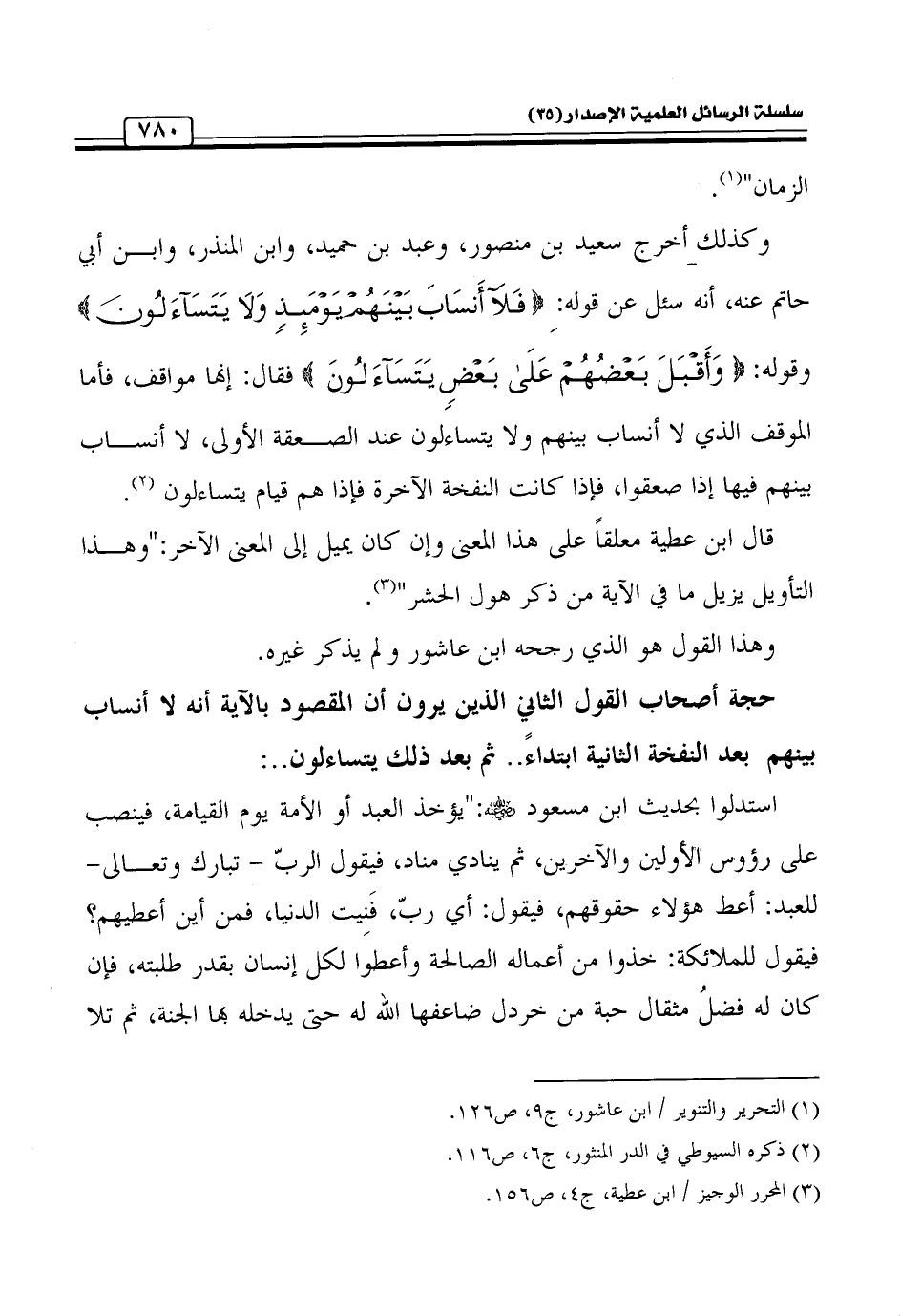 وكذلك أخرج سعيد بن منصور وعبد بن حميد وابن المنذر وابن أبي حاتم عنه، أنه سئل عن قوله: {فَلَا أَنْسَابَ بَيْنَهُمْ يَوْمَئِذٍ وَلَا يَتَسَاءَلُونَ} وقوله: {وَأَقْبَلَ بَعْضُهُمْ عَلَى بَعْضٍ يَتَسَاءَلُونَ} فقال: إنها مواقف، فأما الموقف الذي لا أنساب بينهم ولا يتساءلون عند الصعقة الأولى، لا أنساب بينهم فيها إذا صعقوا، فإذا كانت النفخة الآخرة فإذا هم قيام يتساءلون (¬2).