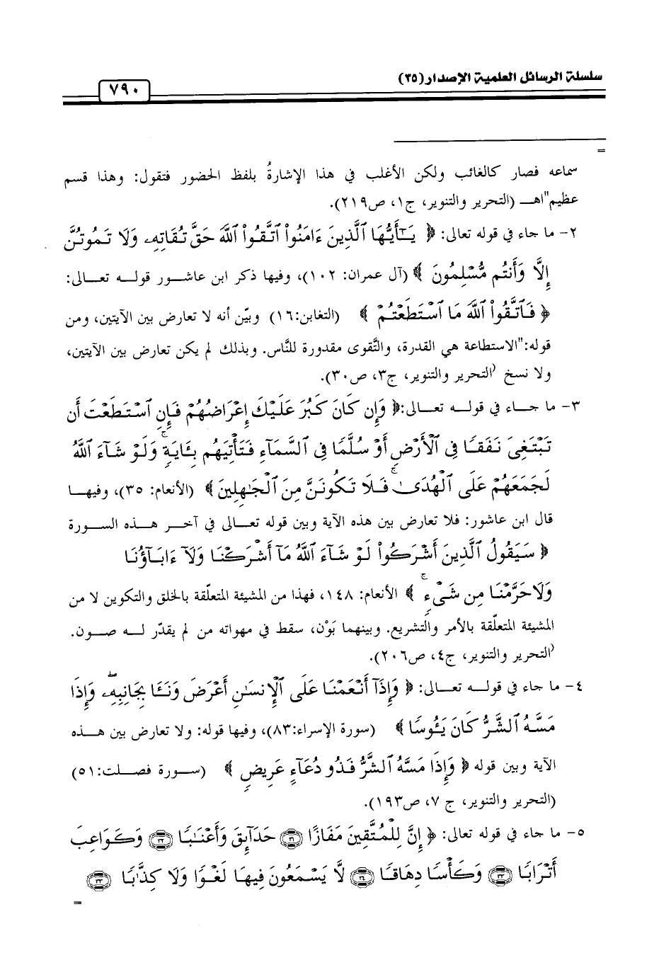 2 - ما جاء في قوله تعالى: {يَاأَيُّهَا الَّذِينَ آمَنُوا اتَّقُوا اللَّهَ حَقَّ تُقَاتِهِ وَلَا تَمُوتُنَّ إِلَّا وَأَنْتُمْ مُسْلِمُونَ} (آل عمران: 102)، وفيها ذكر ابن عاشور قوله تعالى: {فَاتَّقُوا اللَّهَ مَا اسْتَطَعْتُمْ} (التغابن: 16) وبيّن أنه لا تعارض بين الآيتين، ومن قوله: " الاستطاعة هي القدرة، والتَّقوى مقدورة للنَّاس. وبذلك لم يكن تعارض بين الآيتين، ولا نسخ (التحرير والتنوير، ج 3، ص 30).