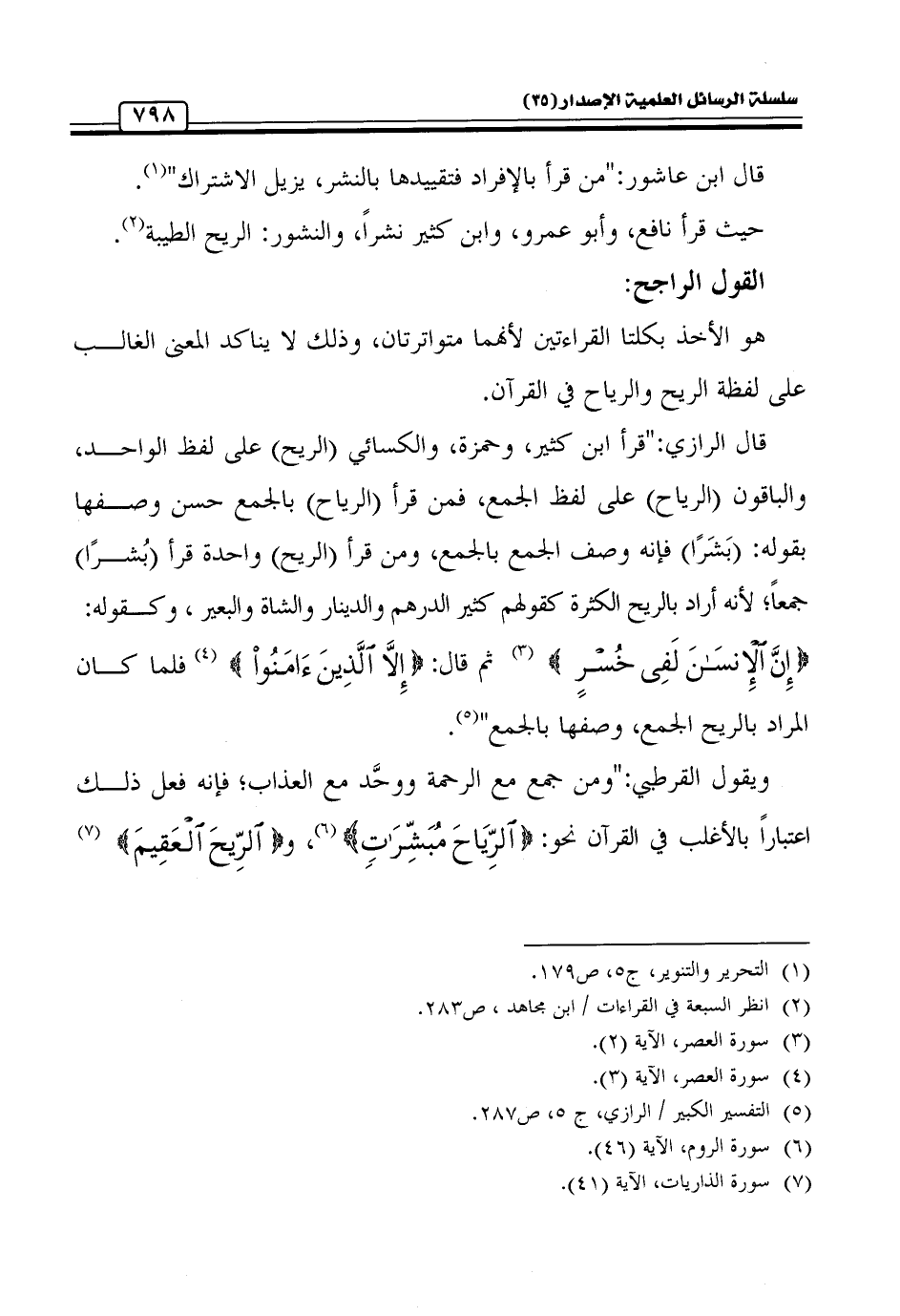 قال الرازي: " قرأ ابن كثير وحمزة والكسائي (الريح) على لفظ الواحد , والباقون (الرياح) على لفظ الجمع، فمن قرأ (الرياح) بالجمع حسن وصفها بقوله: (بَشَرًا) فإنه وصف الجمع بالجمع، ومن قرأ (الريح) واحدة قرأ (بُشرًا) جمعاً؛ لأنه أراد بالريح الكثرة كقولهم كثير الدرهم والدينار والشاة والبعير , وكقوله: {إِنَّ الْإِنْسَانَ لَفِي خُسْرٍ} (¬3) ثم قال: {إِلَّا الَّذِينَ آمَنُوا} (¬4) فلما كان المراد بالريح الجمع , وصفها بالجمع" (¬5).