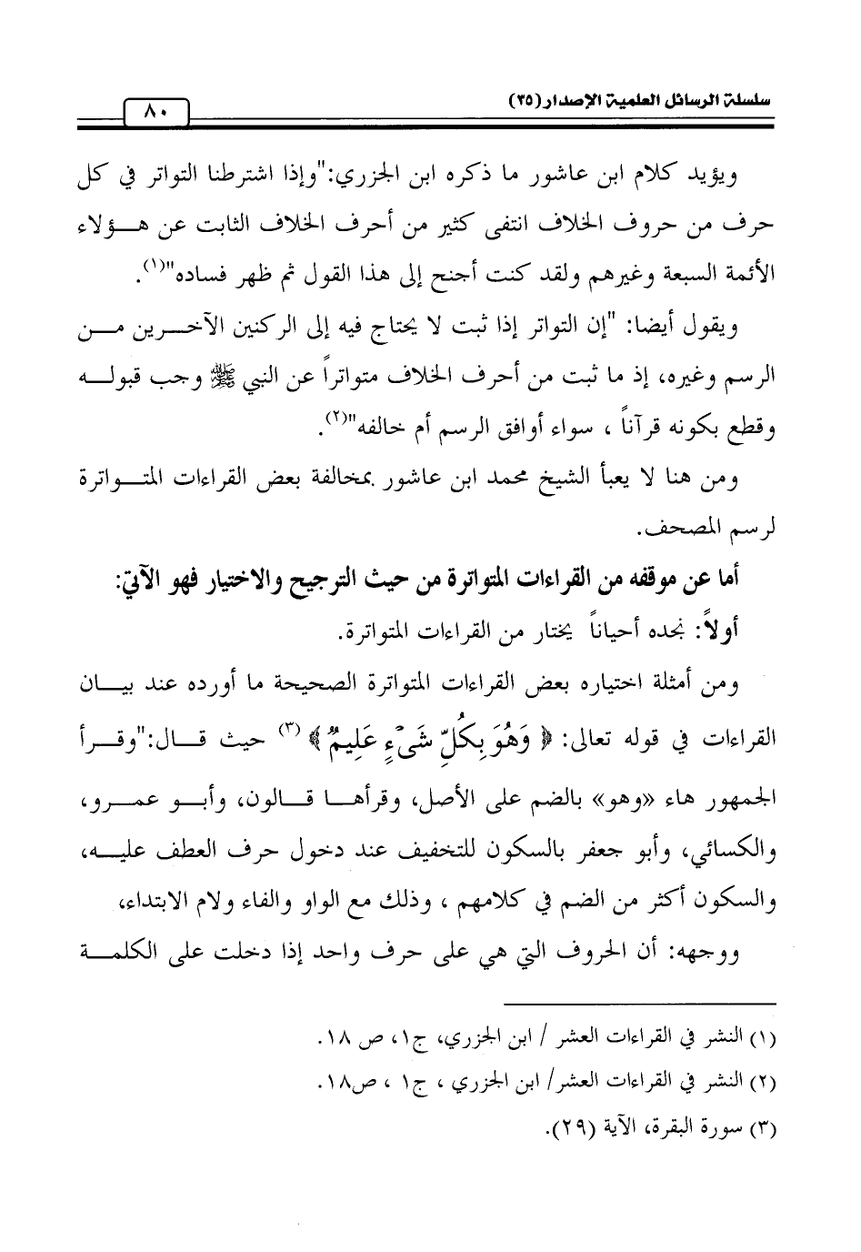 ويؤيد كلام ابن عاشور ما ذكره ابن الجزري: "وإذا اشترطنا التواتر في كل حرف من حروف الخلاف انتفى كثير من أحرف الخلاف الثابت عن هؤلاء الأئمة السبعة وغيرهم ولقد كنت أجنح إلى هذا القول ثم ظهر فساده " (¬1).