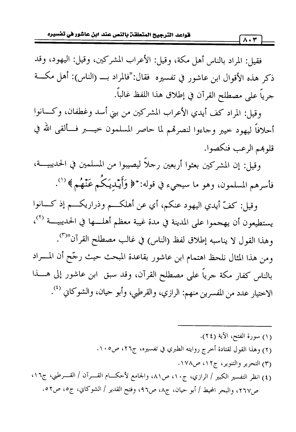 ومن هذا المثال نلحظ اهتمام ابن عاشور بقاعدة المبحث حيث رجّح أن المراد بالناس كفار مكة جرياً على مصطلح القرآن، وقد سبق ابن عاشور إلى هذا الاختيار عدد من المفسرين منهم الرازي، والقرطبي، وأبو حيان، والشوكاني (¬4).
