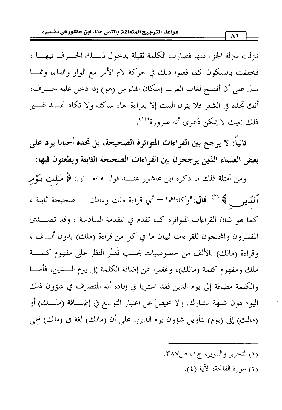 كتاب قواعد الترجيح المتعلقة بالنص عند ابن عاشور في تفسيره التحرير والتنوير