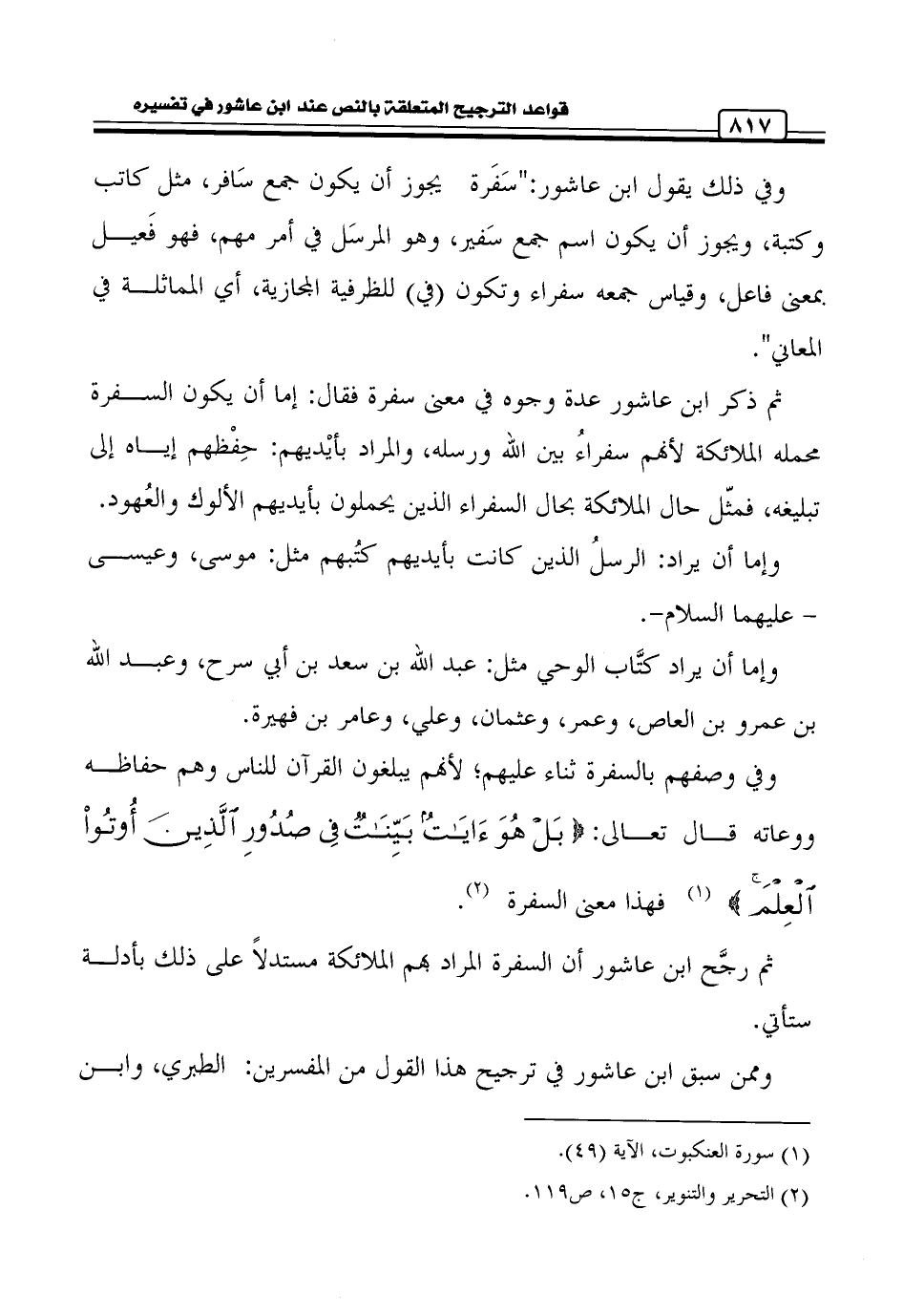 ثم رجَّح ابن عاشور أن السفرة المراد بهم الملائكة مستدلاً على ذلك بأدلة ستأتي.