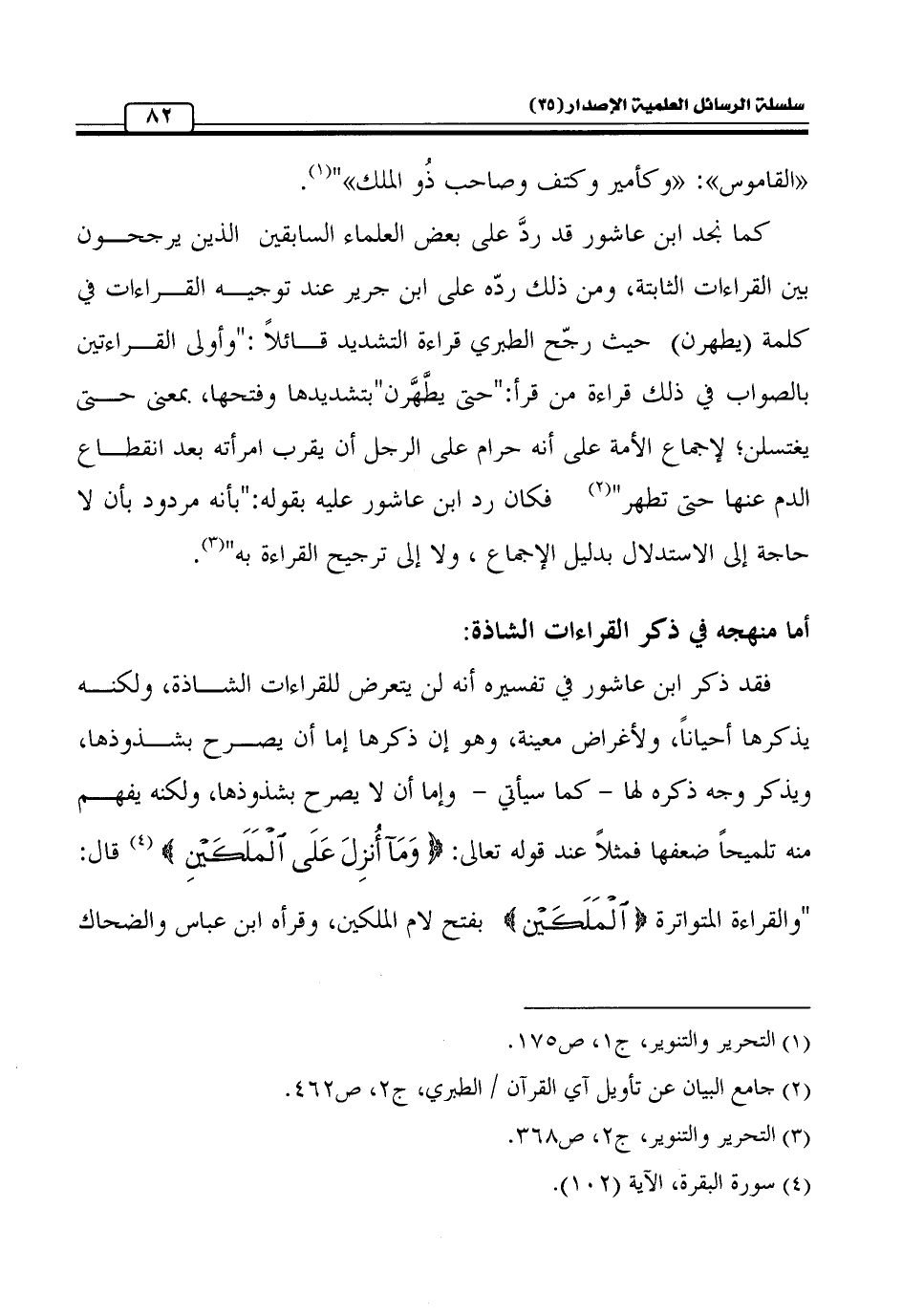 فقد ذكر ابن عاشور في تفسيره أنه لن يتعرض للقراءات الشاذة، ولكنه يذكرها أحياناً، ولأغراض معينة، وهو إن ذكرها إما أن يصرح بشذوذها، ويذكر وجه ذكره لها - كما سيأتي - وإما أن لا يصرح بشذوذها، ولكنه يفهم منه تلميحا ضعفها فمثلاً عند قوله تعالى: {وَمَا أُنْزِلَ عَلَى الْمَلَكَيْنِ} (¬4) قال: "والقراءة المتواترة {الْمَلَكَيْنِ} بفتح لام الملكين، وقرأه ابن عباس والضحاك