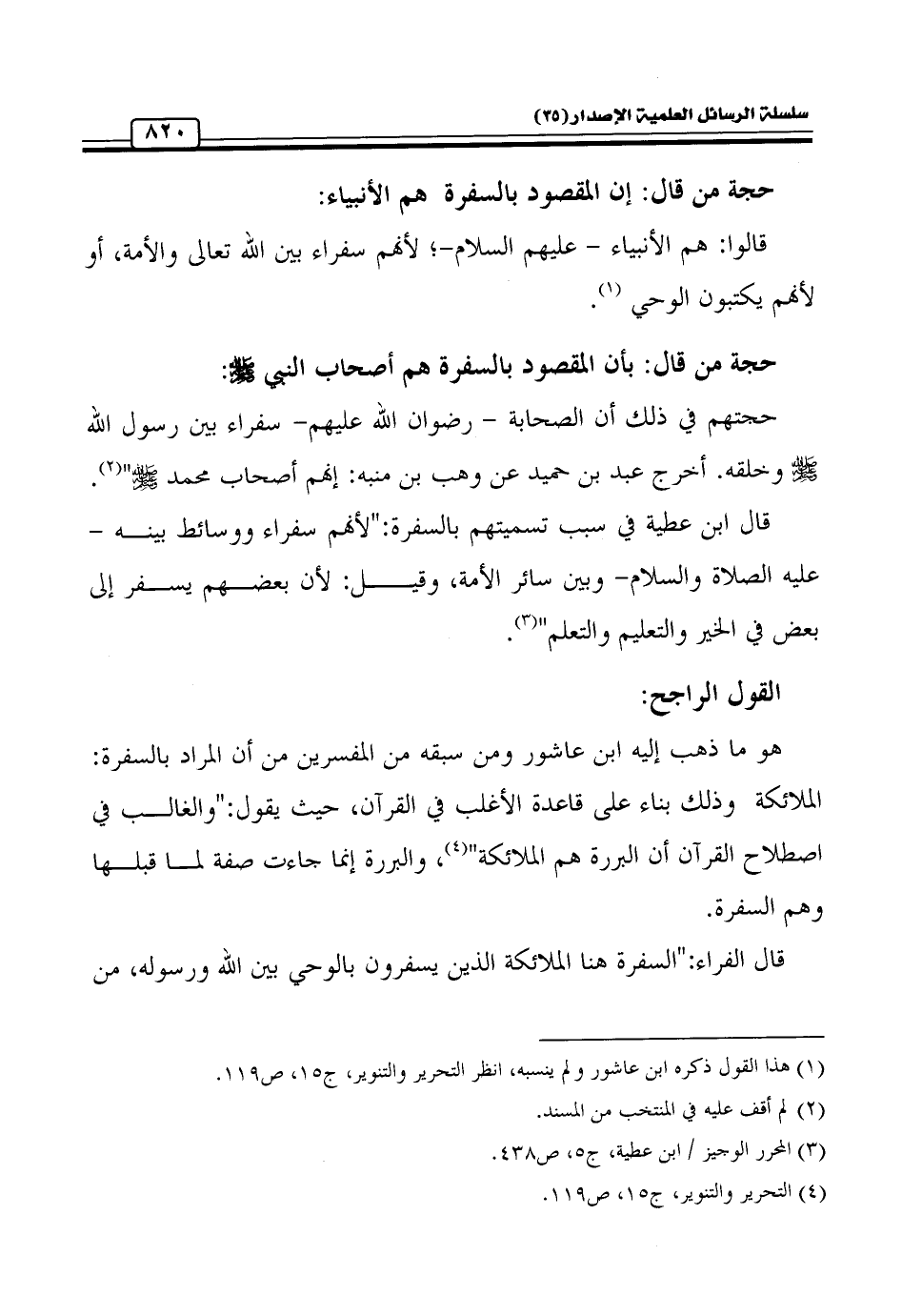 هو ما ذهب إليه ابن عاشور ومن سبقه من المفسرين من أن المراد بالسفرة: الملائكة وذلك بناء على قاعدة الأغلب في القرآن، حيث يقول: " والغالب في اصطلاح القرآن أن البررة هم الملائكة" (¬4)، والبررة إنما جاءت صفة لما قبلها وهم السفرة.