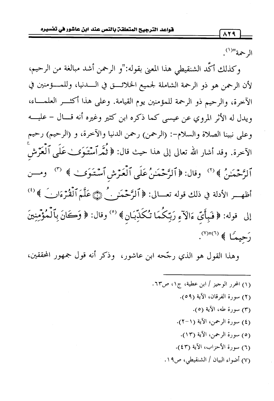 وكذلك أكَّد الشنقيطي هذا المعنى بقوله: "والرحمن أشد مبالغة من الرحيم، لأن الرحمن هو ذو الرحمة الشاملة لجميع الخلائق في الدنيا، وللمؤمنين في الآخرة، والرحيم ذو الرحمة للمؤمنين يوم القيامة. وعلى هذا أكثر العلماء، ويدل له الأثر المروي عن عيسى كما ذكره ابن كثير وغيره أنه قال عليه وعلى نبينا الصلاة والسلام: (الرحمن) رحمن الدنيا والآخرة، و (الرحيم) رحيم الآخرة. وقد أشار الله تعالى إلى هذا حيث قال: {ثُمَّ اسْتَوَى عَلَى الْعَرْشِ الرَّحْمَنُ} (¬2) وقال: {الرَّحْمَنُ عَلَى الْعَرْشِ اسْتَوَى} (¬3) ومن أظهر الأدلة في ذلك قوله تعالى: {الرَّحْمَنُ (1) عَلَّمَ الْقُرْآنَ} (¬4) إلى قوله: {فَبِأَيِّ آلَاءِ رَبِّكُمَا تُكَذِّبَانِ} (¬5) وقال: {وَكَانَ بِالْمُؤْمِنِينَ رَحِيمًا} (¬6) " (¬7).