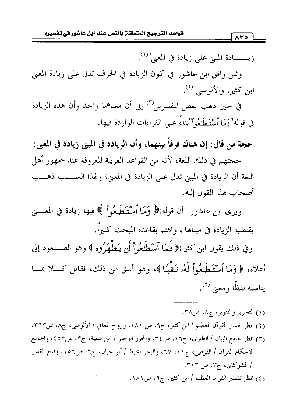 ويرى ابن عاشور أن قوله: {وَمَا اسْتَطَاعُوا} فيها زيادة في المعنى يقتضيه الزيادة في مبناها , واهتم بقاعدة المبحث كثيراً.