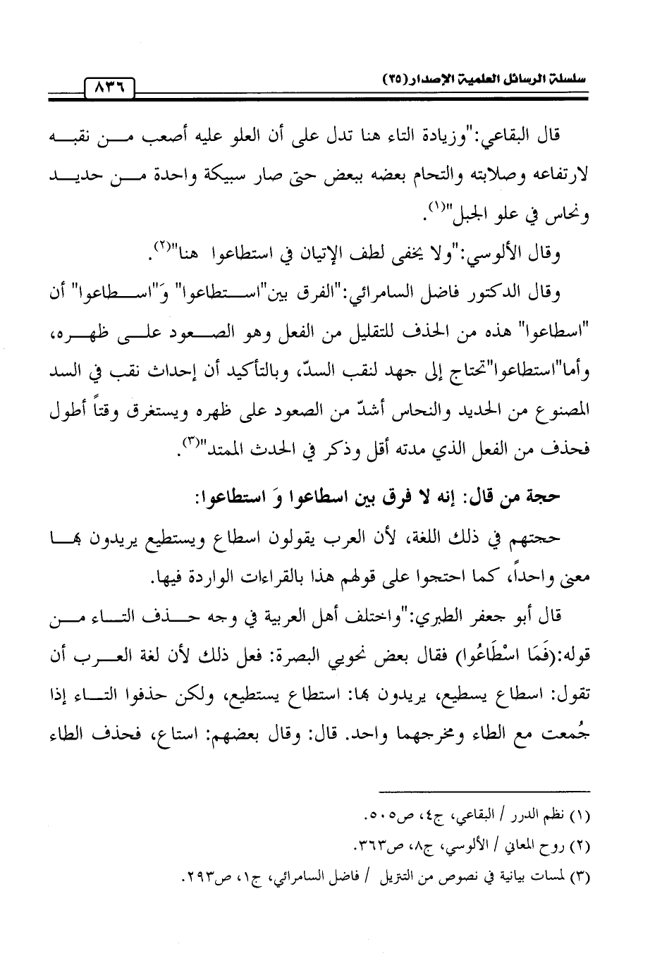 وقال الدكتور فاضل السامرائي: " الفرق بين " استطاعوا " وَ " اسطاعوا " أن "اسطاعوا" هذه من الحذف للتقليل من الفعل وهو الصعود على ظهره، وأما "استطاعوا" تحتاج إلى جهد لنقب السدّ، وبالتأكيد أن إحداث نقب في السد المصنوع من الحديد والنحاس أشدّ من الصعود على ظهره ويستغرق وقتاً أطول فحذف من الفعل الذي مدته أقل وذكر في الحدث الممتد " (¬3).