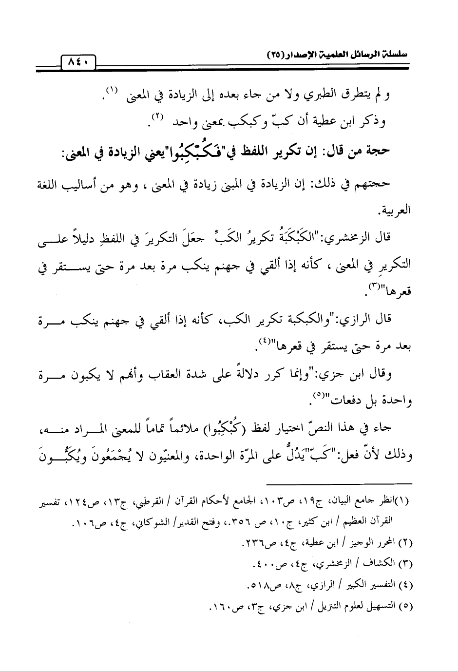 وقال ابن جزي: " وإنما كرر دلالةً على شدة العقاب وأنهم لا يكبون مرة واحدة بل دفعات " (¬5).
