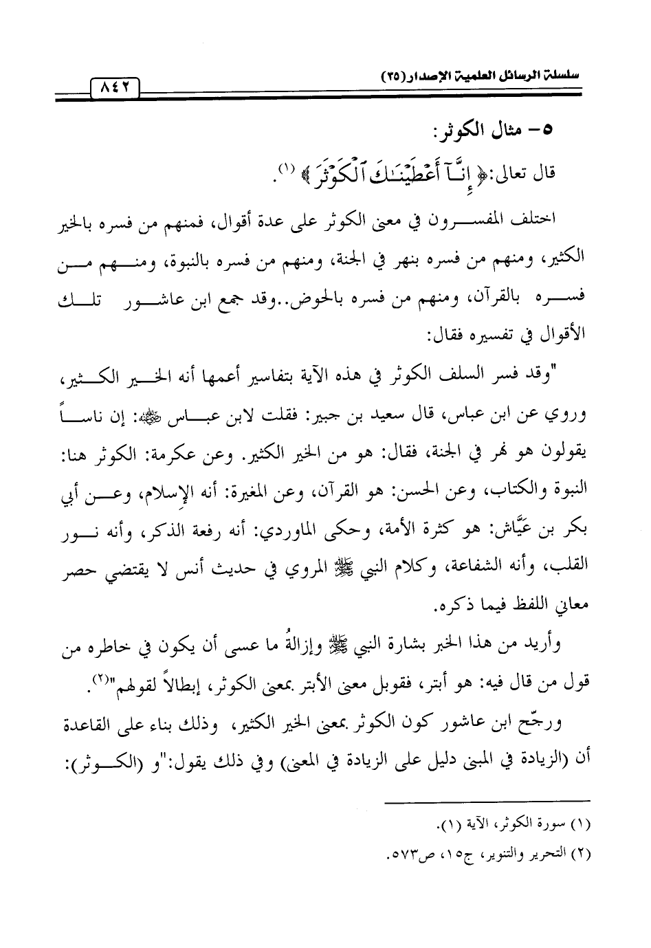 ورجّح ابن عاشور كون الكوثر بمعنى الخير الكثير , وذلك بناء على القاعدة أن (الزيادة في المبنى دليل على الزيادة في المعنى) وفي ذلك يقول: " و (الكوثر):